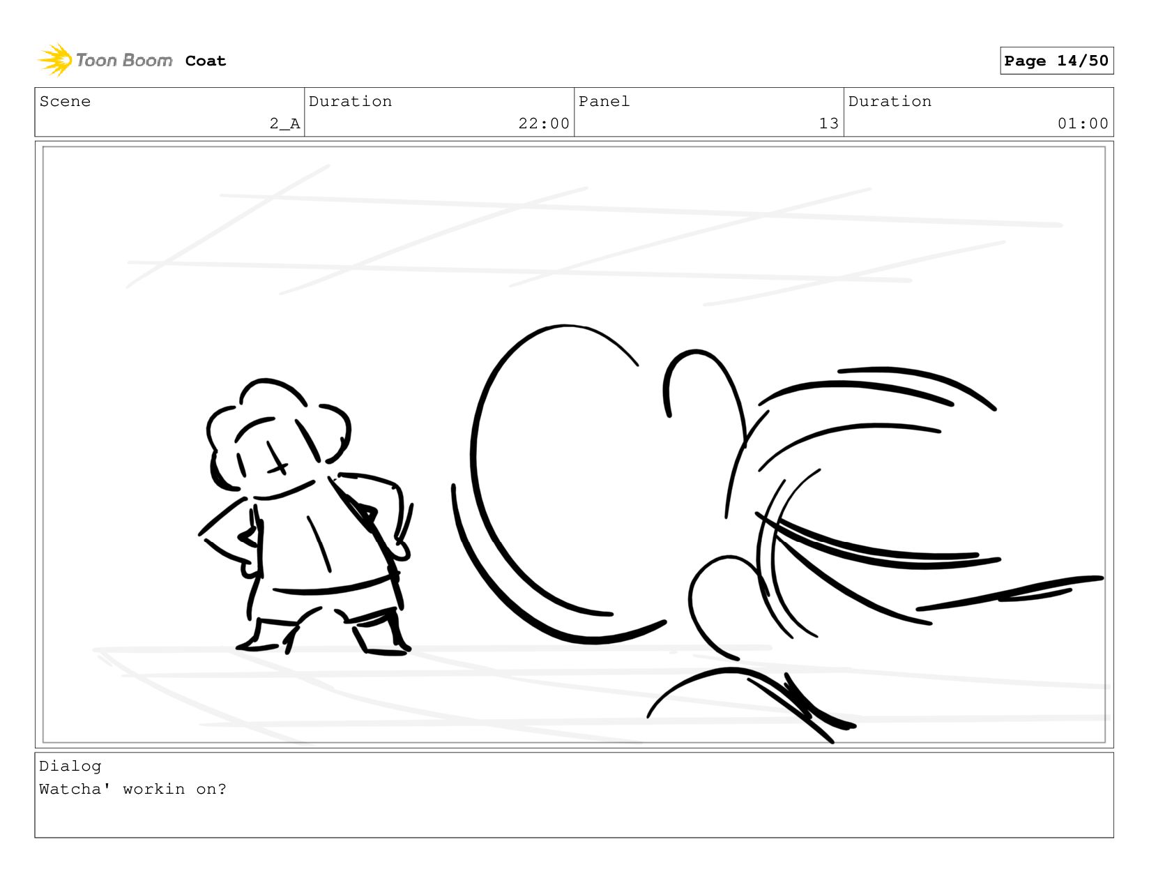 Scene 2_A Duration 22:00 Panel 13 Duration 01:00 Dialog Watcha'