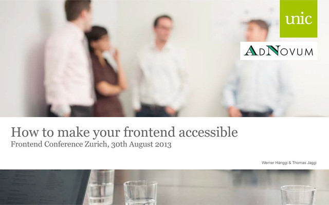 (@w3c_wai): http://www.w3.org/TR/WCAG20/ • P028: http://www.isb.admin.ch/themen/standards/alle/03237/ • Consulting and certification: • Access for all (@Access4All): http://www.access-for-all.ch • Research, recommendations and news: • The Paciello Group by Steve Faulkner (@stevefaulkner) & Co.: http://www.paciellogroup.com/ • WebAIM (@WebAIM) by Jared Smith (@jared_w_smith) & Co. : http://webaim.org/ • Simply Accessible by Derek Featherstone (@feather): http://simplyaccessible.com/ • Accessible Culture by Jason Kiss (@jkiss): http://accessibleculture.org/ • Juicy Studio by Gez Lemon (@gezlemon): http://juicystudio.com/ • Karl Groves (@karlgroves): http://www.karlgroves.com/ • Marco’s accessibility blog (@MarcoZehe): http://www.marcozehe.de/ • The Accessibility Project (@ A11YProject): http://a11yproject.com/ 5. Resources 20