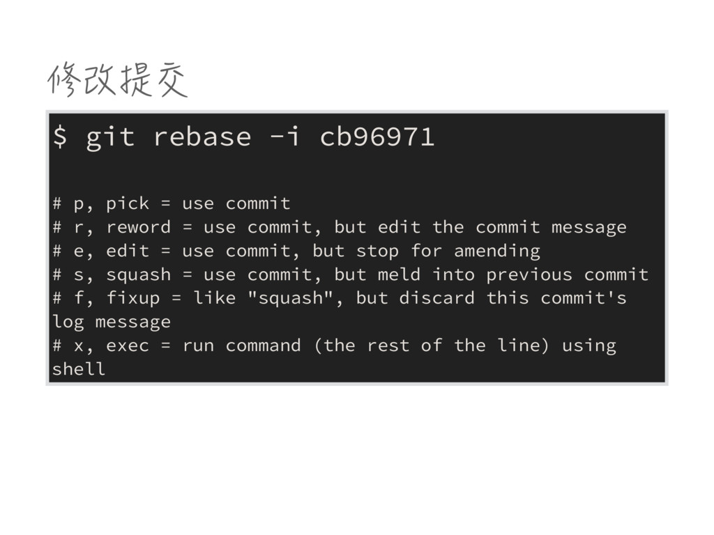 use commit # r, reword = use commit, but edit the commit message # e, edit = use commit, but stop for amending # s, squash = use commit, but meld into previous commit # f, fixup = like "squash", but discard this commit's log message # x, exec = run command (the rest of the line) using shell
