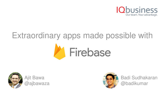 In this session, Badi and Ajit will take the audience through a brief introduction to Firebase followed by a live demo of building a real-world application using the Firebase SDK. The demo will showcase key features of the platform including realtime data synchronization, user authentication and session management aiming to provide developers with a broad overview and with enough depth to quickly get up and running with Firebase for their current and future projects.