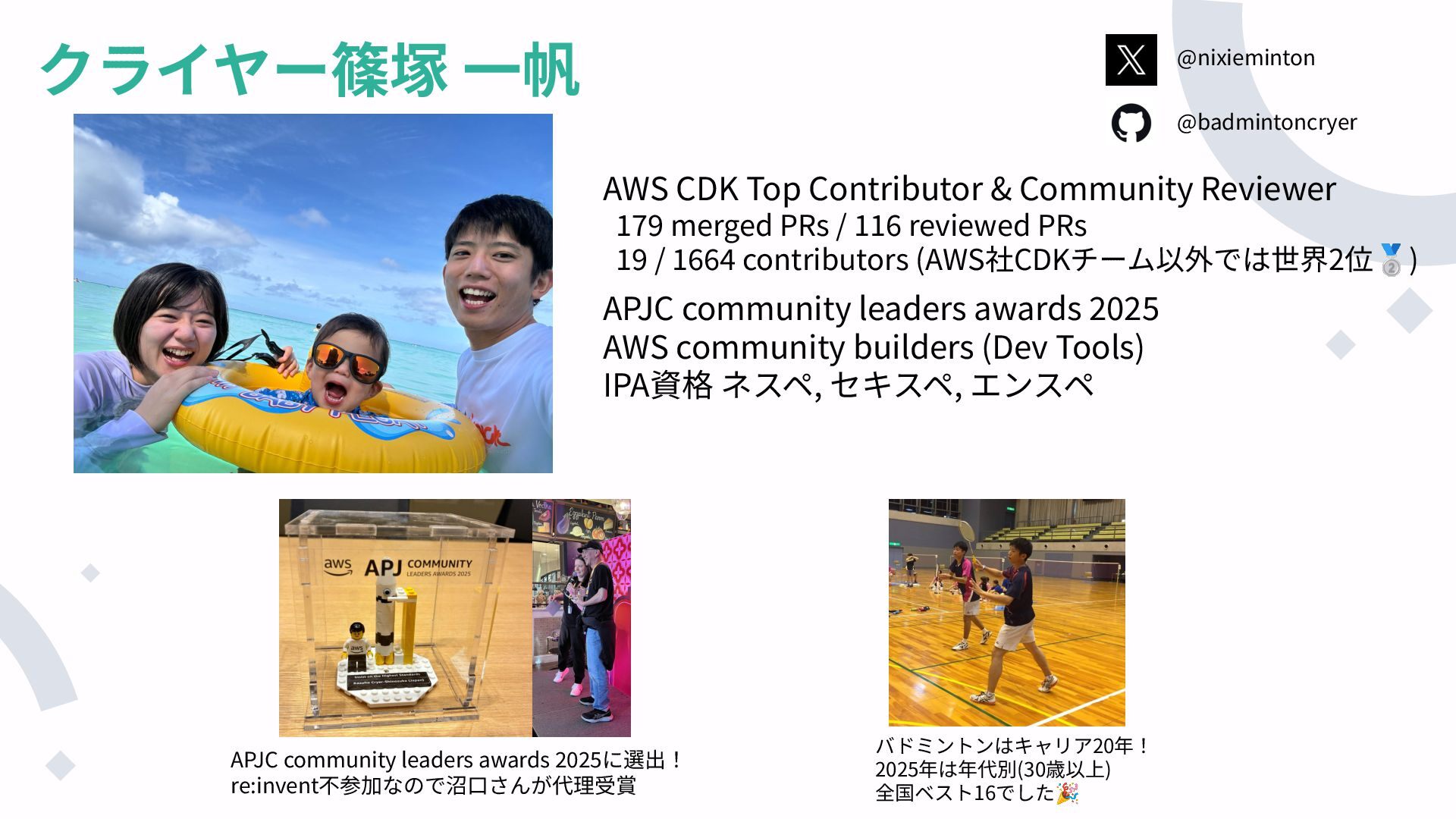 Reviewer 179 merged PRs / 116 reviewed PRs 19 / 1664 contributors (AWS社CDKチーム以外では世界2位🥈) APJC community leaders awards 2025 AWS community builders (Dev Tools) IPA資格 ネスペ, セキスペ, エンスペ バドミントンはキャリア20年! 2025年は年代別(30歳以上) 全国ベスト16でした🎉 APJC community leaders awards 2025に選出! re:invent不参加なので沼⼝さんが代理受賞