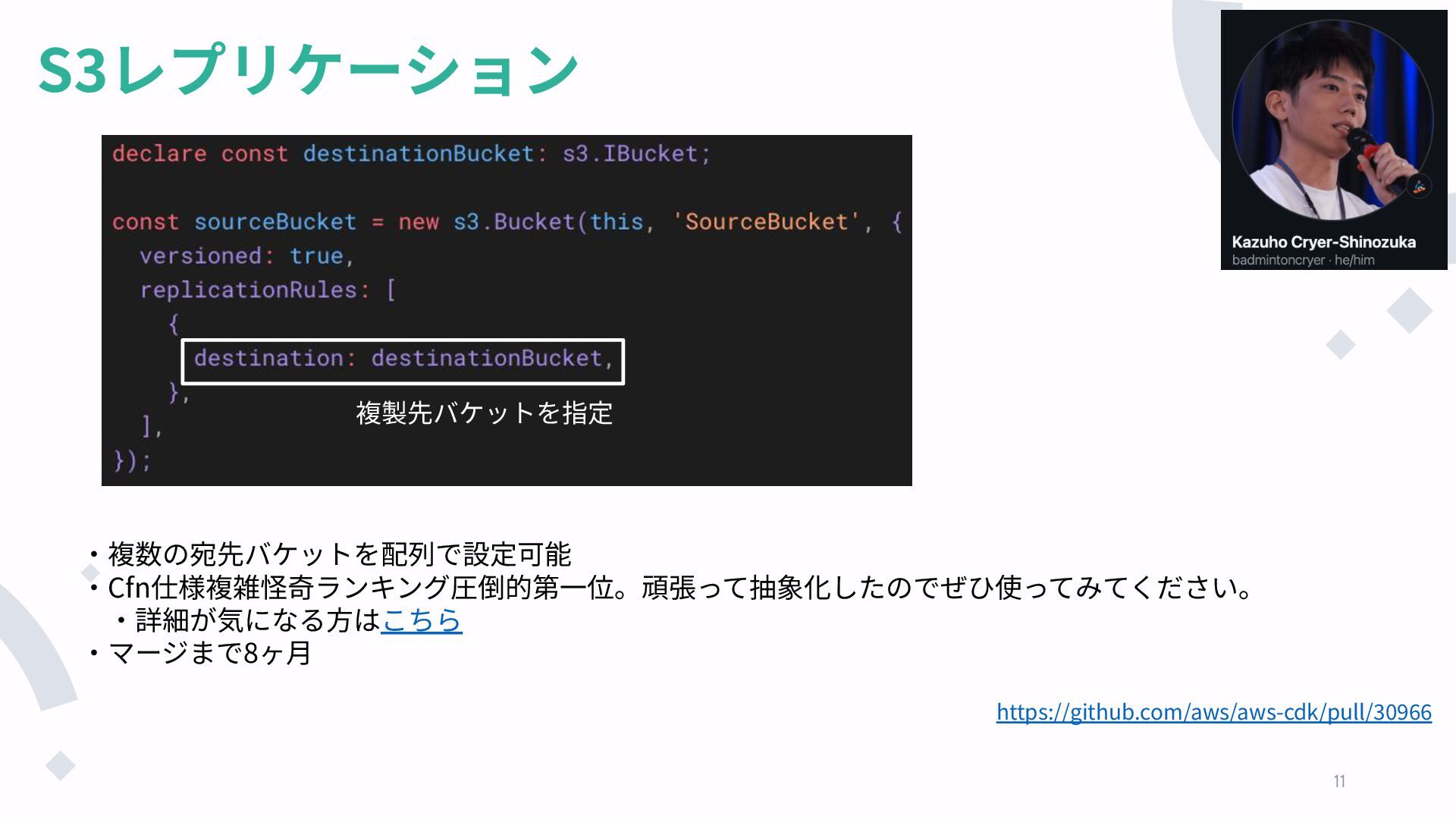 S3レプリケーション 11 https://github.com/aws/aws-cdk/pull/30966 ‧複数の宛先バケットを配列で設定可能 ‧Cfn仕様複雑怪奇ランキング圧倒的第⼀位。頑張って抽象化したのでぜひ使ってみてください。 ‧詳細が気になる⽅はこちら ‧マージまで8ヶ⽉ 複製先バケットを指定