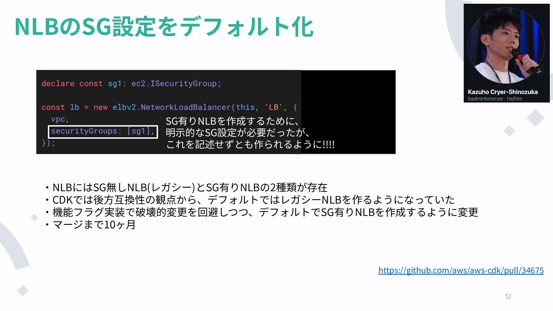 NLBのSG設定をデフォルト化 12 https://github.com/aws/aws-cdk/pull/34675 ‧NLBにはSG無しNLB(レガシー)とSG有りNLBの2種類が存在 ‧CDKでは後⽅互換性の観点から、デフォルトではレガシーNLBを作るようになっていた ‧機能フラグ実装で破壊的変更を回避しつつ、デフォルトでSG有りNLBを作成するように変更 ‧マージまで10ヶ⽉ SG有りNLBを作成するために、 明⽰的なSG設定が必要だったが、 これを記述せずとも作られるように!!!!