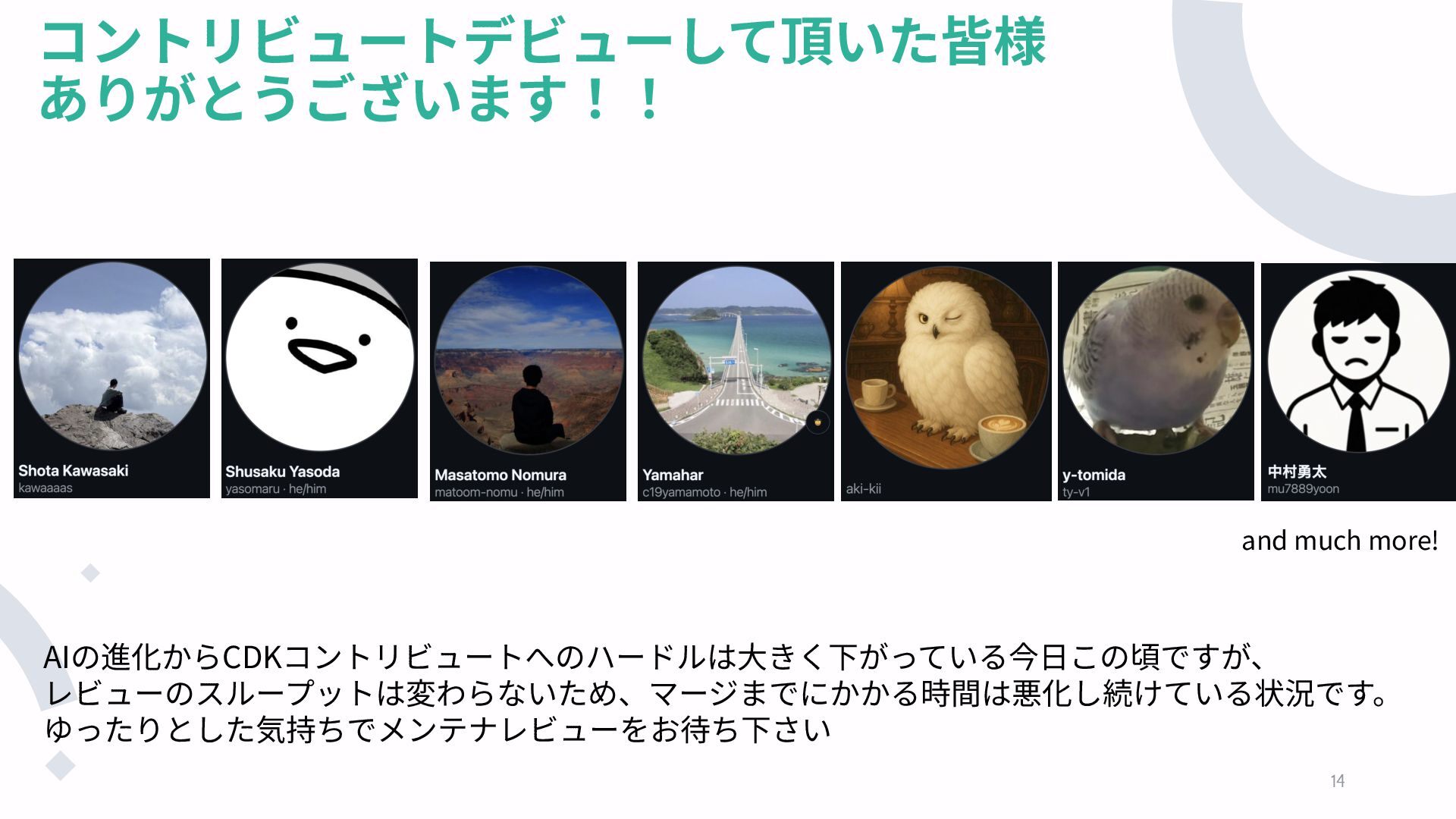 コントリビュートデビューして頂いた皆様 ありがとうございます!! 14 AIの進化からCDKコントリビュートへのハードルは⼤きく下がっている今⽇この頃ですが、 レビューのスループットは変わらないため、マージまでにかかる時間は悪化し続けている状況です。 ゆったりとした気持ちでメンテナレビューをお待ち下さい and much more!