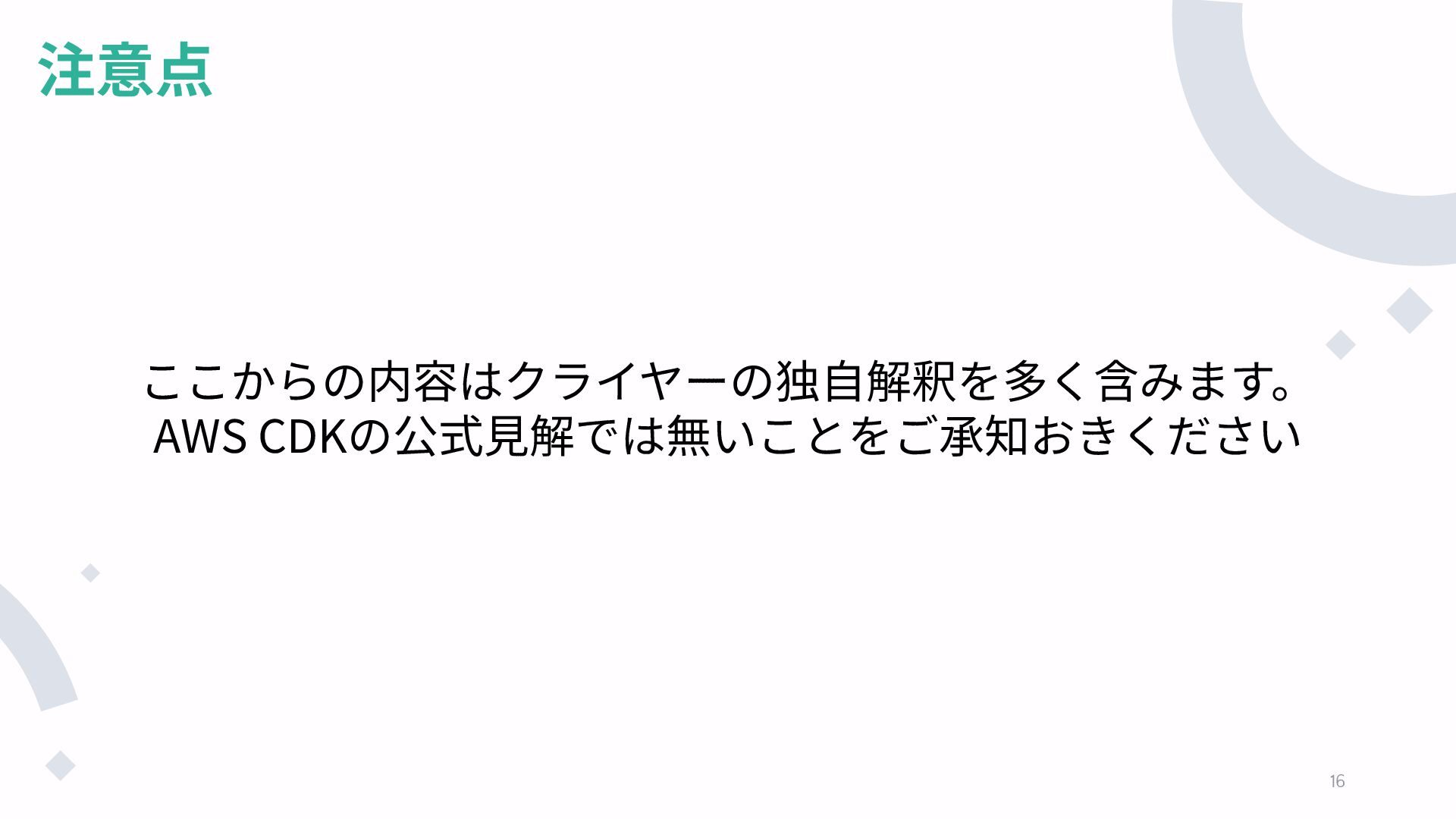 注意点 16 ここからの内容はクライヤーの独⾃解釈を多く含みます。 AWS CDKの公式⾒解では無いことをご承知おきください