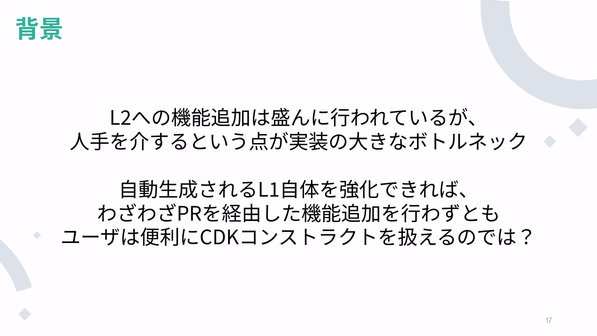 背景 17 L2への機能追加は盛んに⾏われているが、 ⼈⼿を介するという点が実装の⼤きなボトルネック ⾃動⽣成されるL1⾃体を強化できれば、 わざわざPRを経由した機能追加を⾏わずとも ユーザは便利にCDKコンストラクトを扱えるのでは?