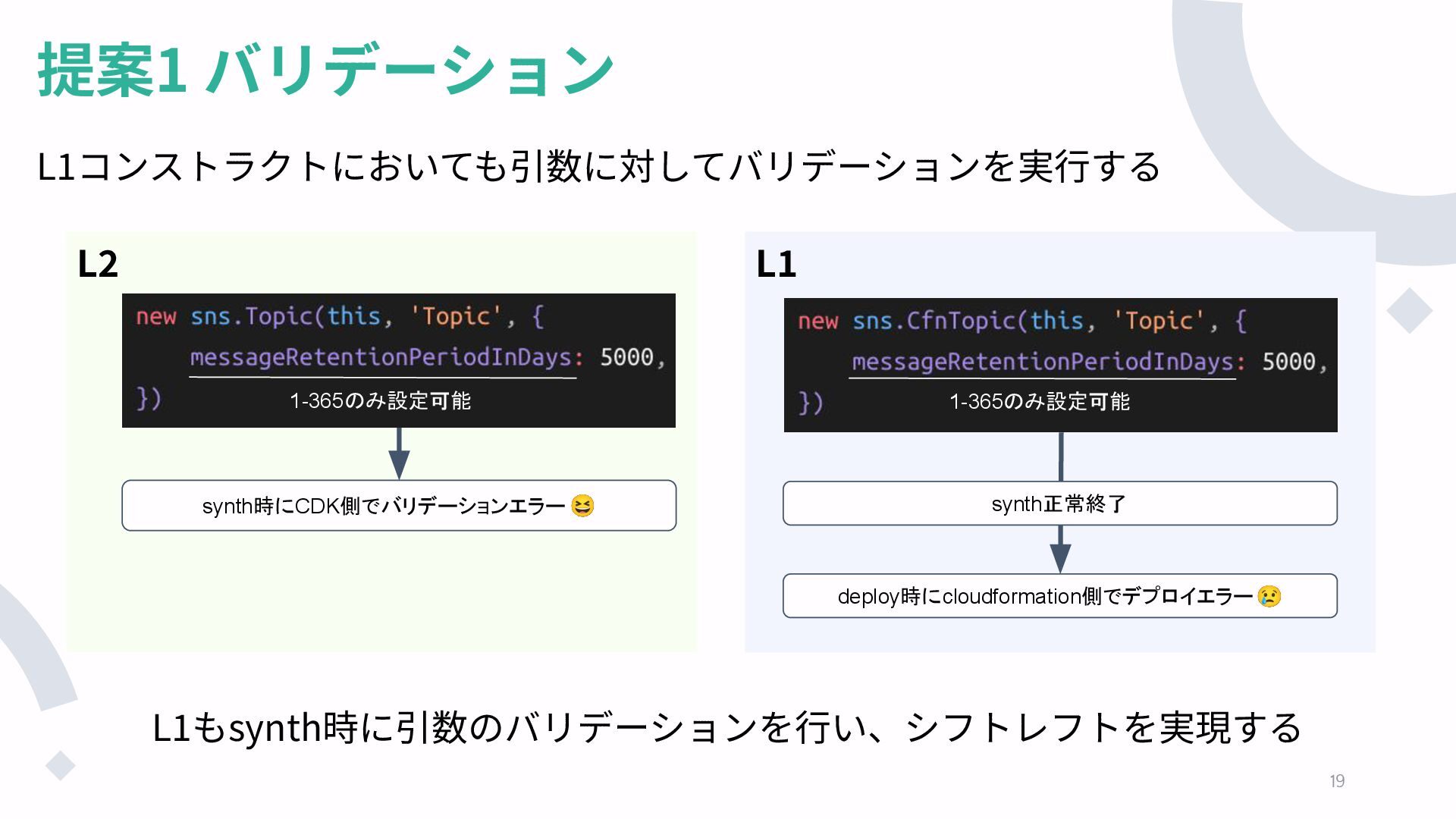 提案1 バリデーション 19 L1コンストラクトにおいても引数に対してバリデーションを実⾏する L2 L1 L1もsynth時に引数のバリデーションを⾏い、シフトレフトを実現する deploy時にcloudformation側でデプロイエラー😢 synth時にCDK側でバリデーションエラー 😆
