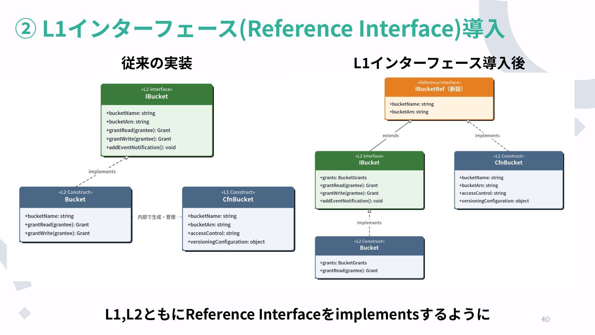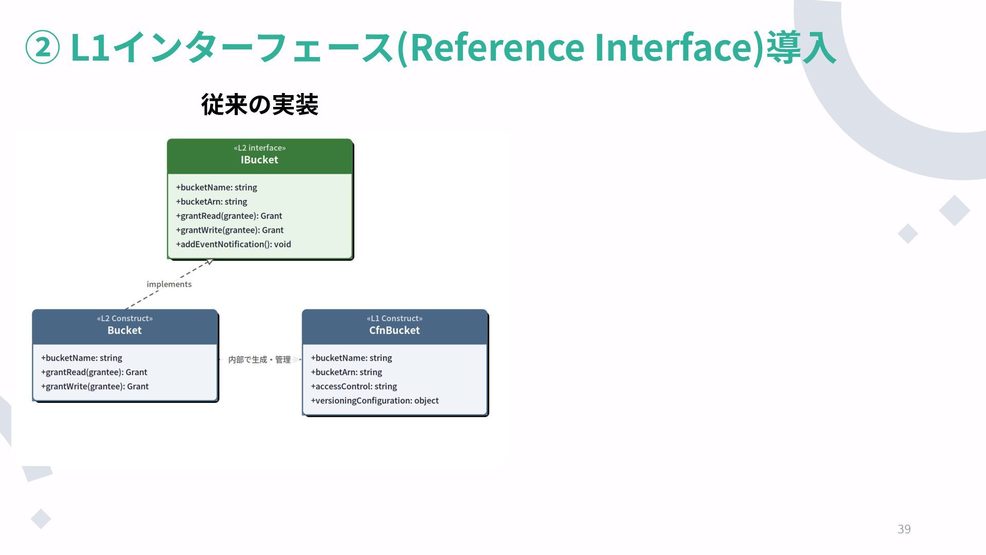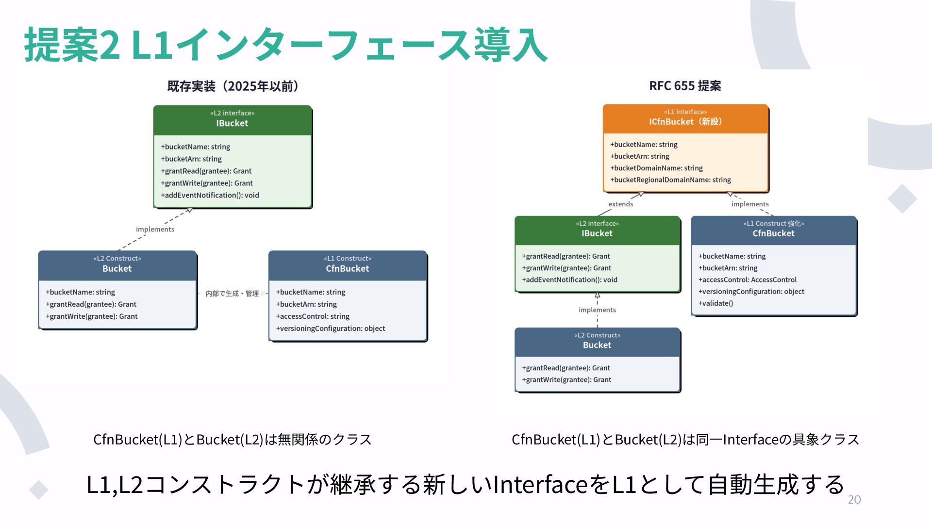 提案2 L1インターフェース導⼊ 20 L1,L2コンストラクトが継承する新しいInterfaceをL1として⾃動⽣成する CfnBucket(L1)とBucket(L2)は無関係のクラス CfnBucket(L1)とBucket(L2)は同⼀Interfaceの具象クラス