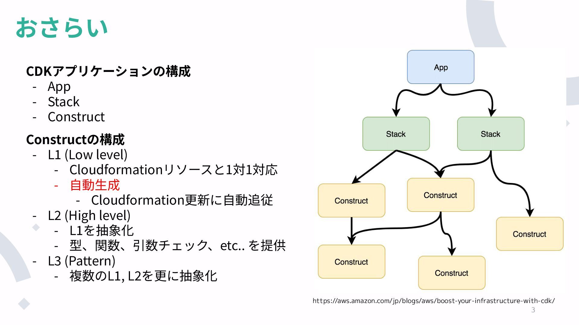 おさらい https://aws.amazon.com/jp/blogs/aws/boost-your-infrastructure-with-cdk/ CDKアプリケーションの構成 - App - Stack - Construct Constructの構成