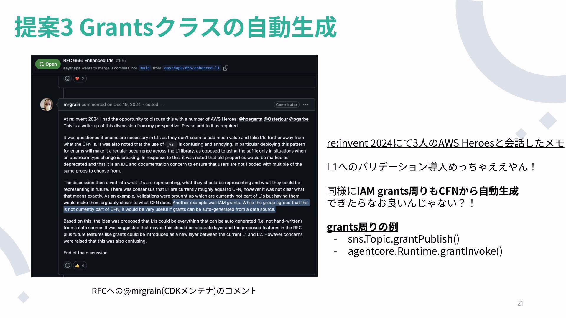 提案3 Grantsクラスの⾃動⽣成 21 RFCへの@mrgrain(CDKメンテナ)のコメント re:invent 2024にて3⼈のAWS Heroesと会話したメモ L1へのバリデーション導⼊めっちゃええやん! 同様にIAM grants周りもCFNから⾃動⽣成
