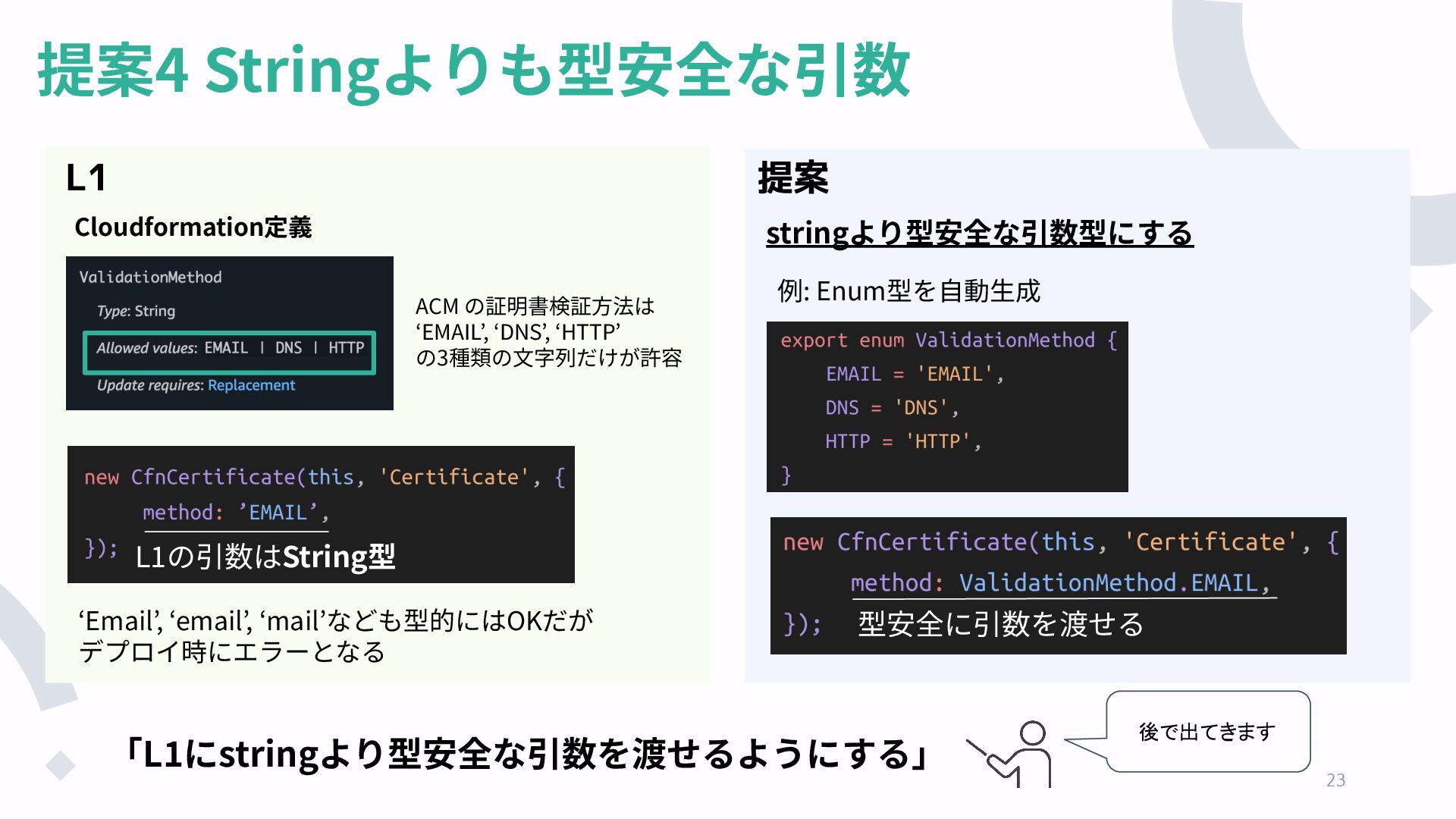 提案4 Stringよりも型安全な引数 22 ACM の証明書検証⽅法は ʻEMAIL’, ʻDNS’, ʻHTTP’ の3種類の⽂字列だけが許容 Cloudformation定義