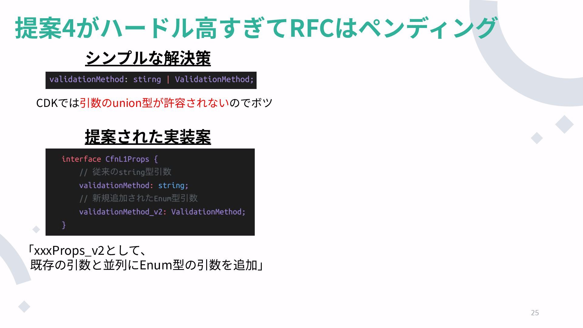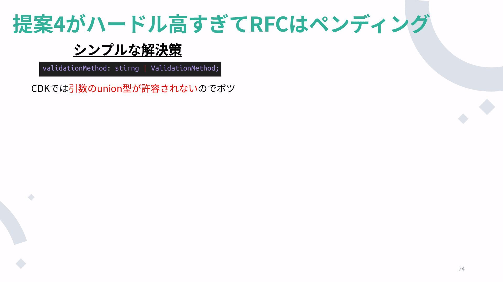 提案4がハードル⾼すぎてRFCはペンディング 24 CDKでは引数のunion型が許容されないのでボツ シンプルな解決策