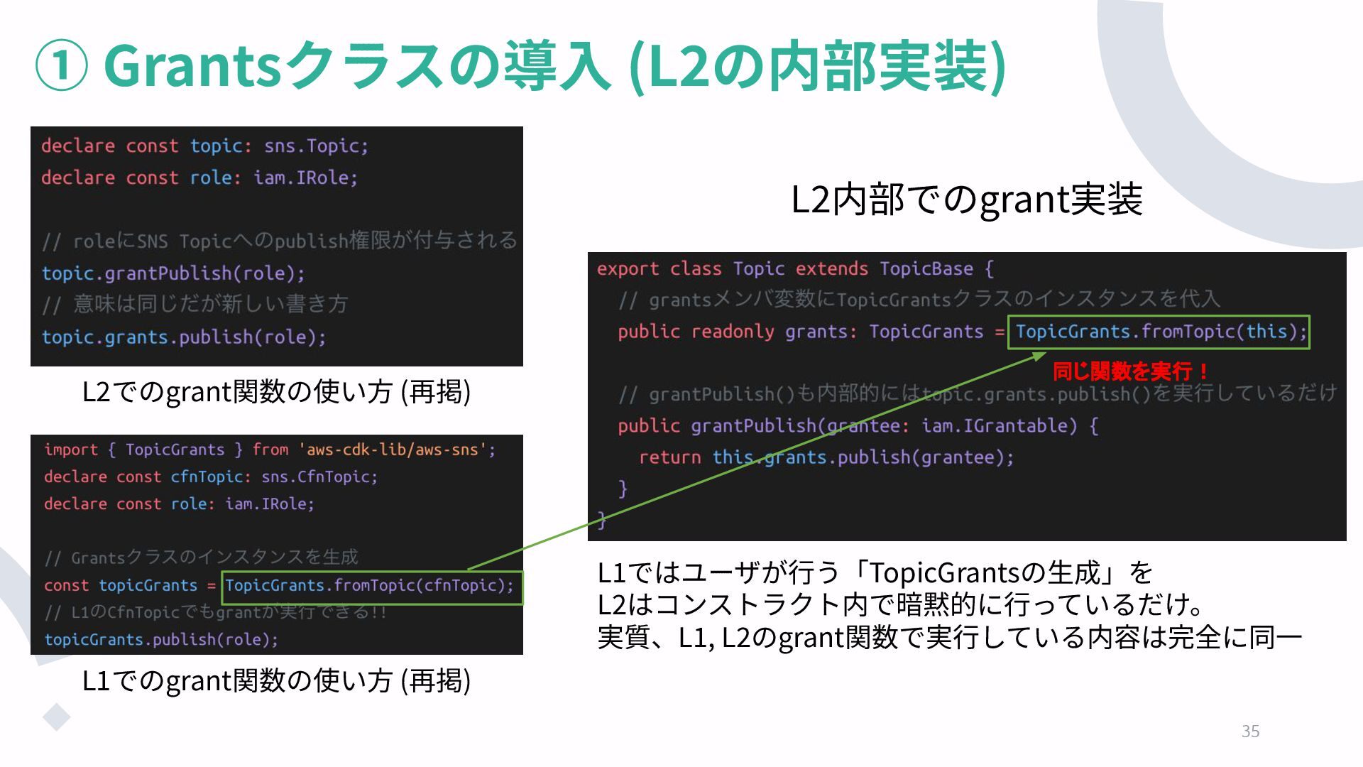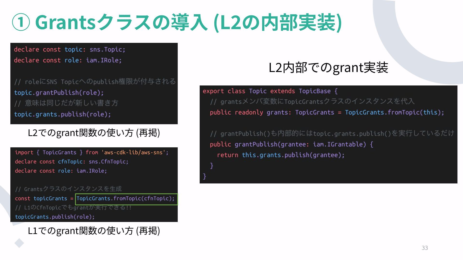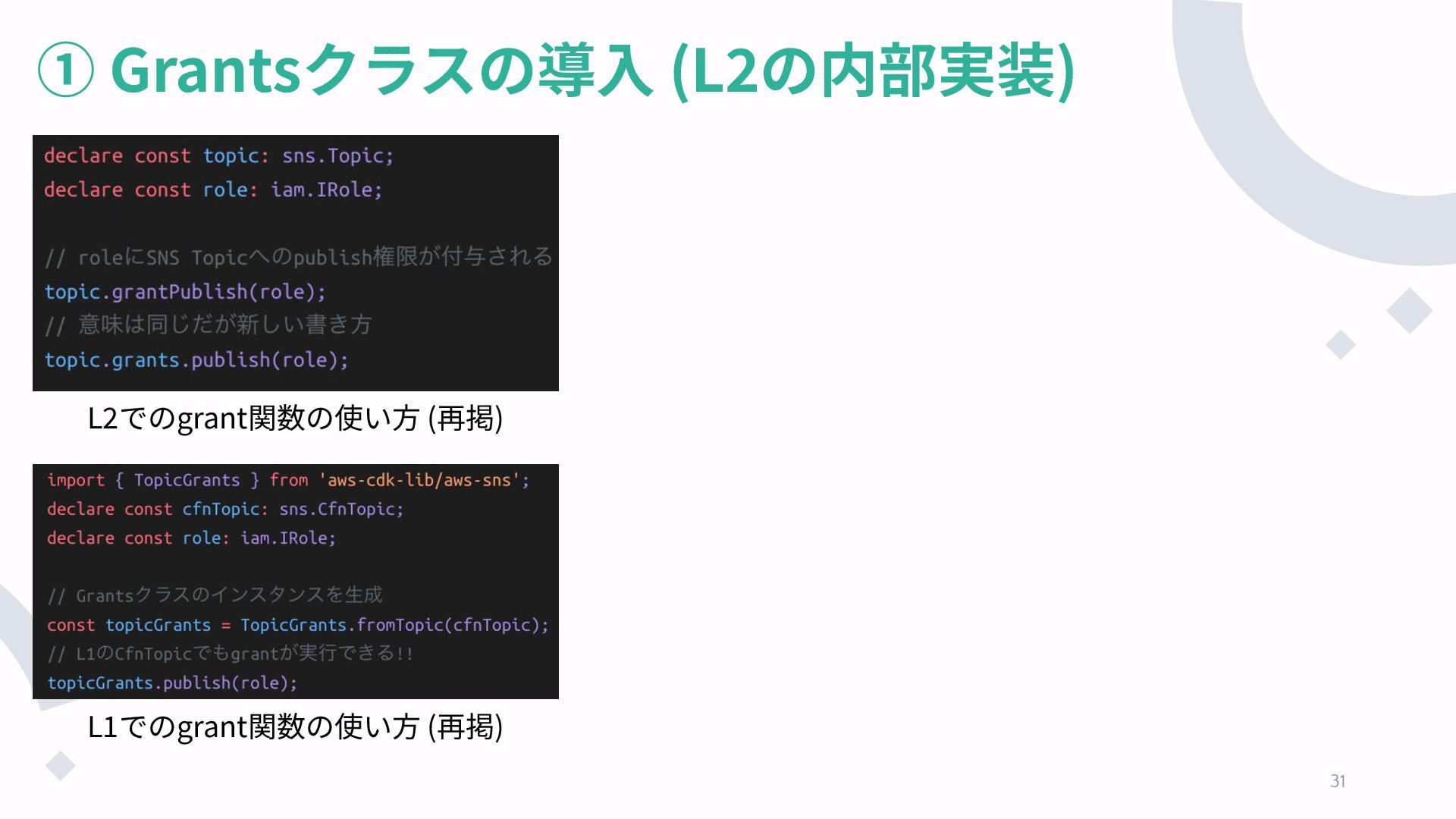 ① Grantsクラスの導⼊ 30 L2 L1 ⾮常に便利なgrantXxx関数だが、 L2でしか使えないことが⻑年の⽋点だった L1コンストラクトであっても、 Grantsクラス(TopicGrants)を⽣成することで grant関数が実⾏可能に!!!!!
