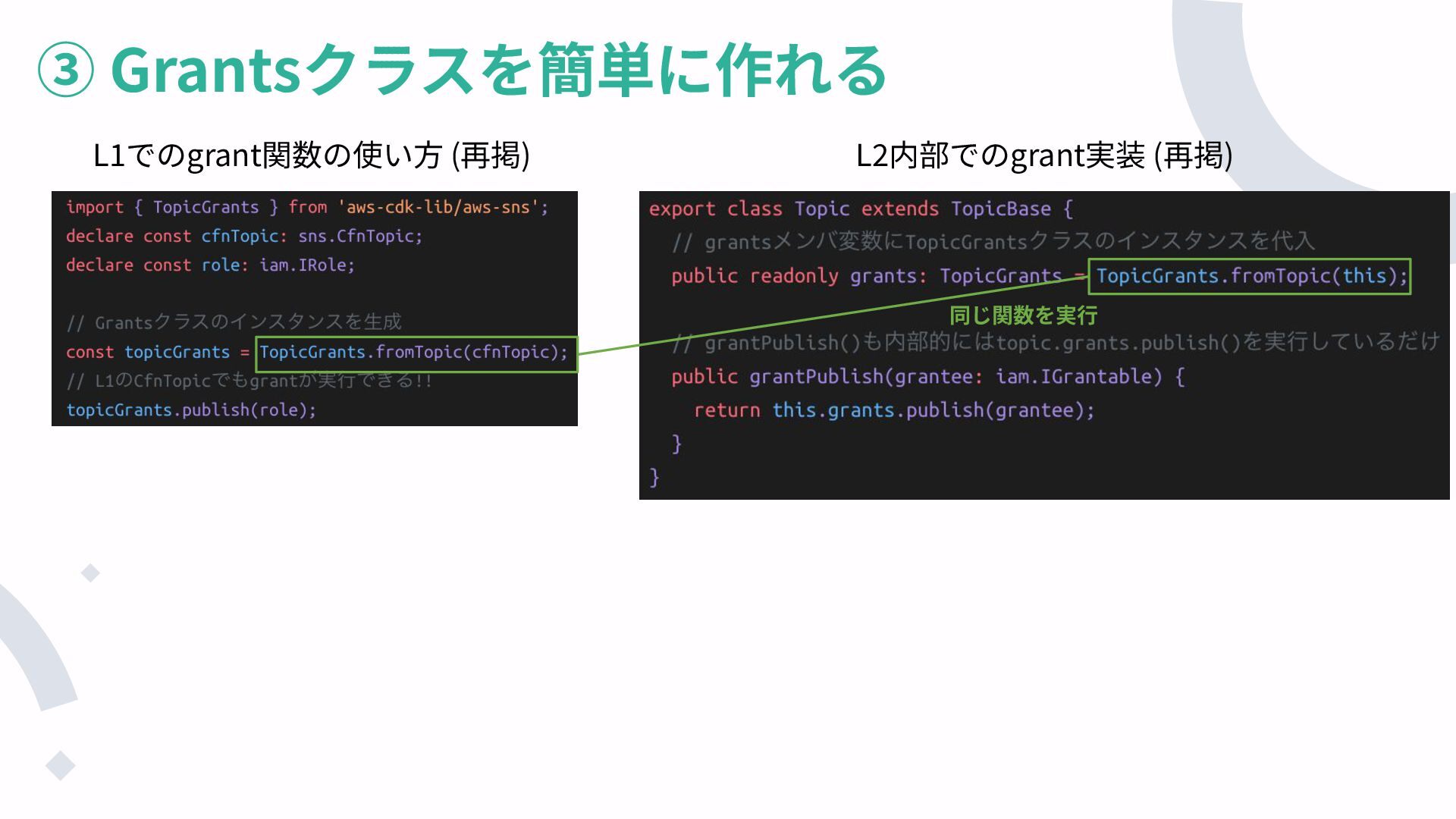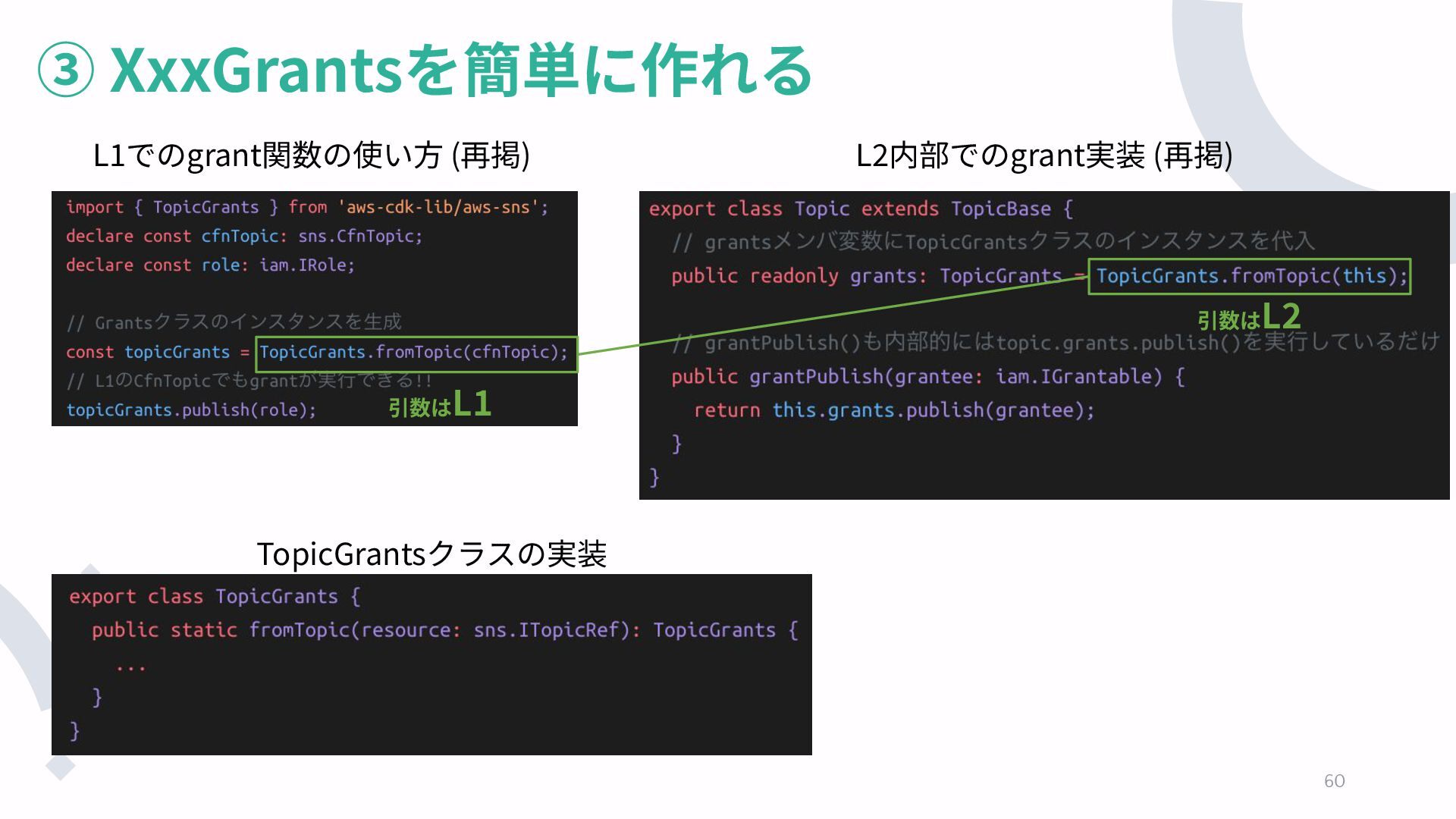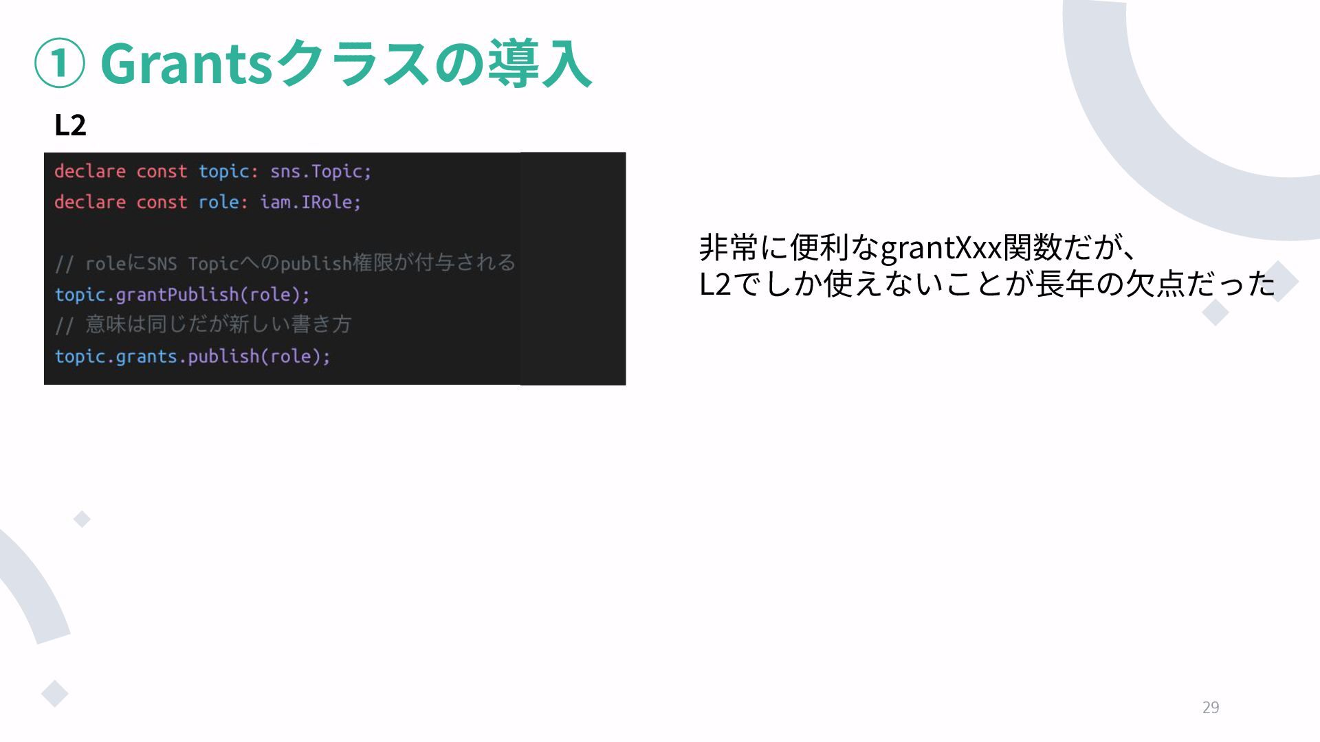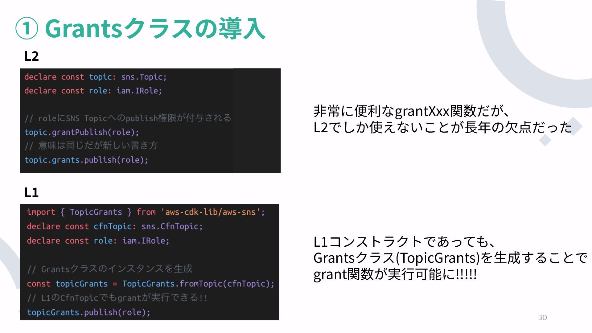 ① Grantsクラスの導⼊ 30 L2 L1 ⾮常に便利なgrantXxx関数だが、 L2でしか使えないことが⻑年の⽋点だった L1コンストラクトであっても、 Grantsクラス(TopicGrants)を⽣成することで grant関数が実⾏可能に!!!!!