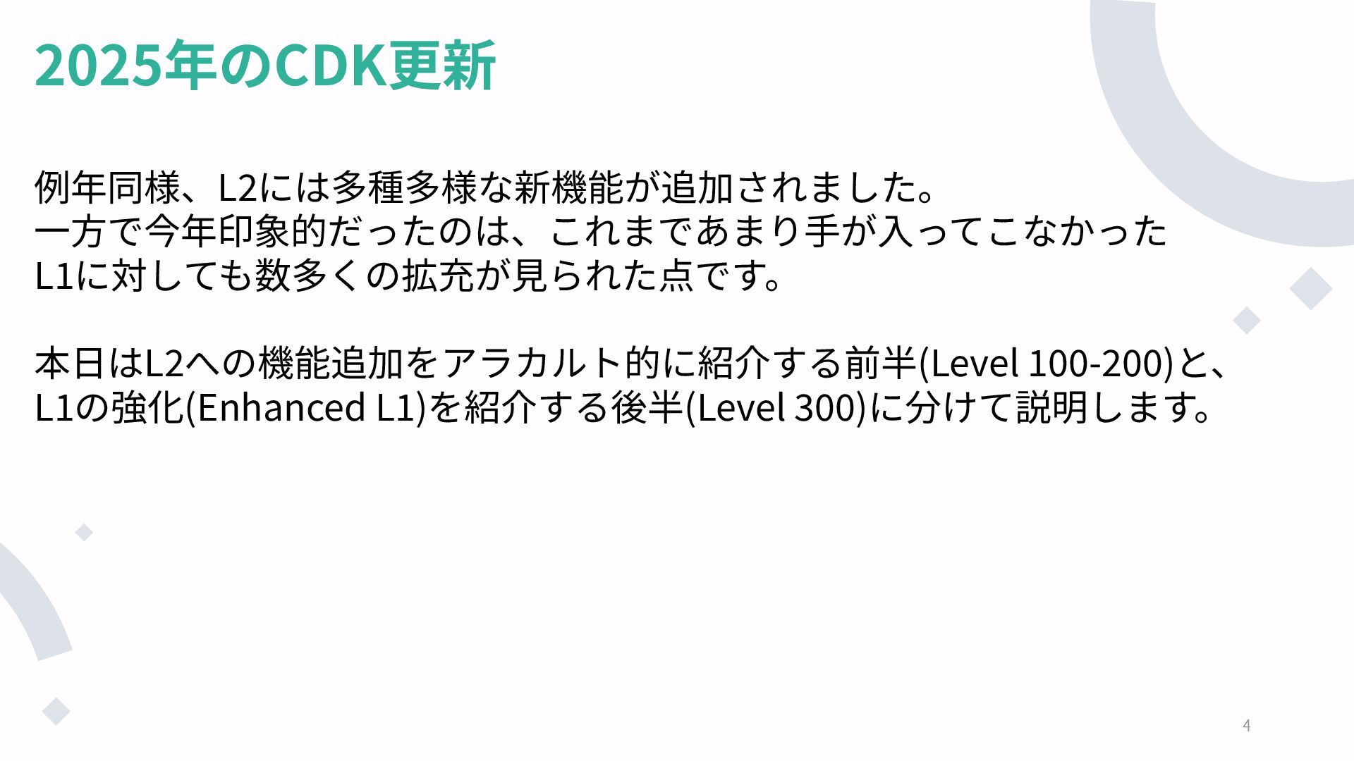 2025年のCDK更新 4 例年同様、L2には多種多様な新機能が追加されました。 ⼀⽅で今年印象的だったのは、これまであまり⼿が⼊ってこなかった L1に対しても数多くの拡充が⾒られた点です。 本⽇はL2への機能追加をアラカルト的に紹介する前半(Level 100-200)と、 L1の強化(Enhanced L1)を紹介する後半(Level 300)に分けて説明します。