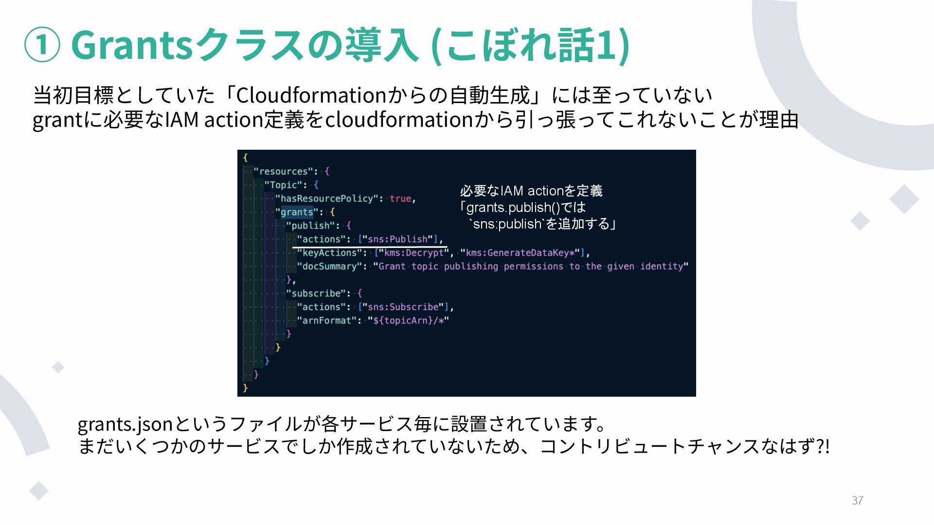 ① Grantsクラスの導⼊ (こぼれ話1) 37 grants.jsonというファイルが各サービス毎に設置されています。 まだいくつかのサービスでしか作成されていないため、コントリビュートチャンスなはず?! 当初⽬標としていた「Cloudformationからの⾃動⽣成」には⾄っていない grantに必要なIAM action定義をcloudformationから引っ張ってこれないことが理由 必要なIAM