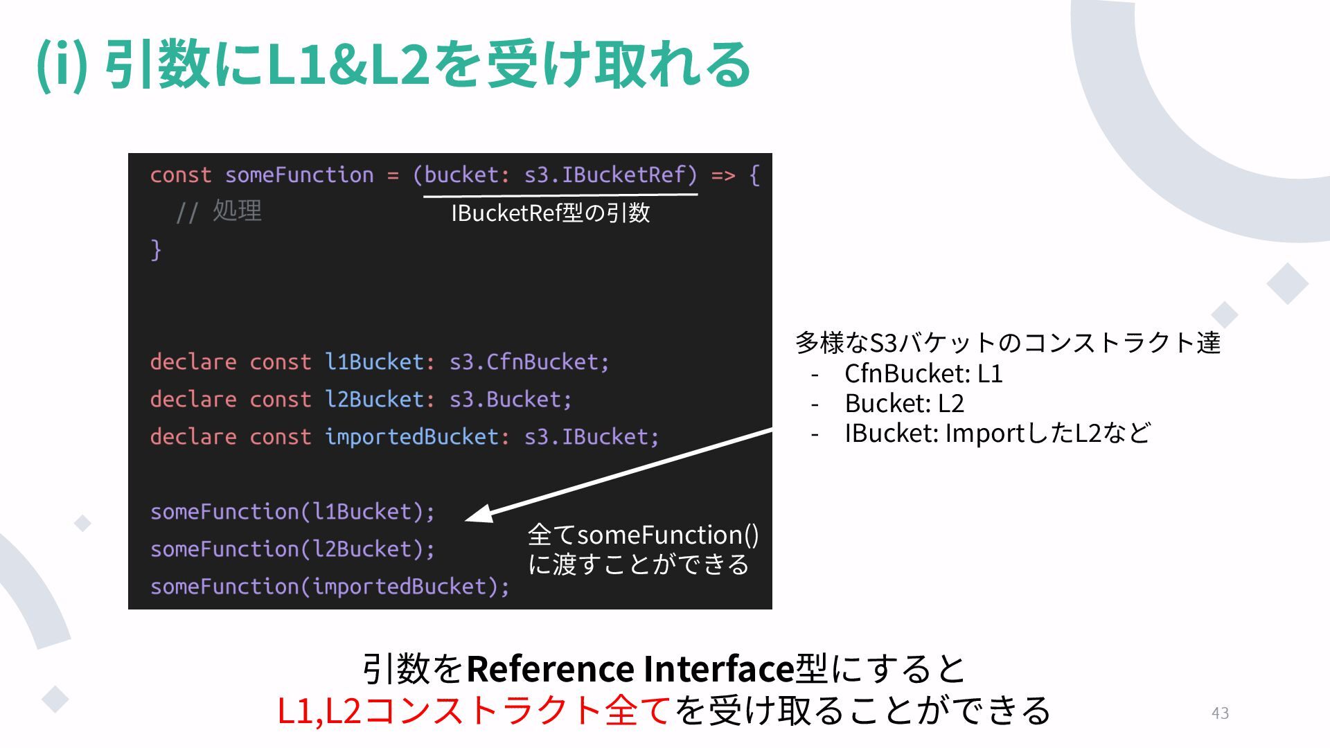 (i) 引数にL1&L2を受け取れる 43 引数をReference Interface型にすると L1,L2コンストラクト全てを受け取ることができる IBucketRef型の引数 多様なS3バケットのコンストラクト達 - CfnBucket: