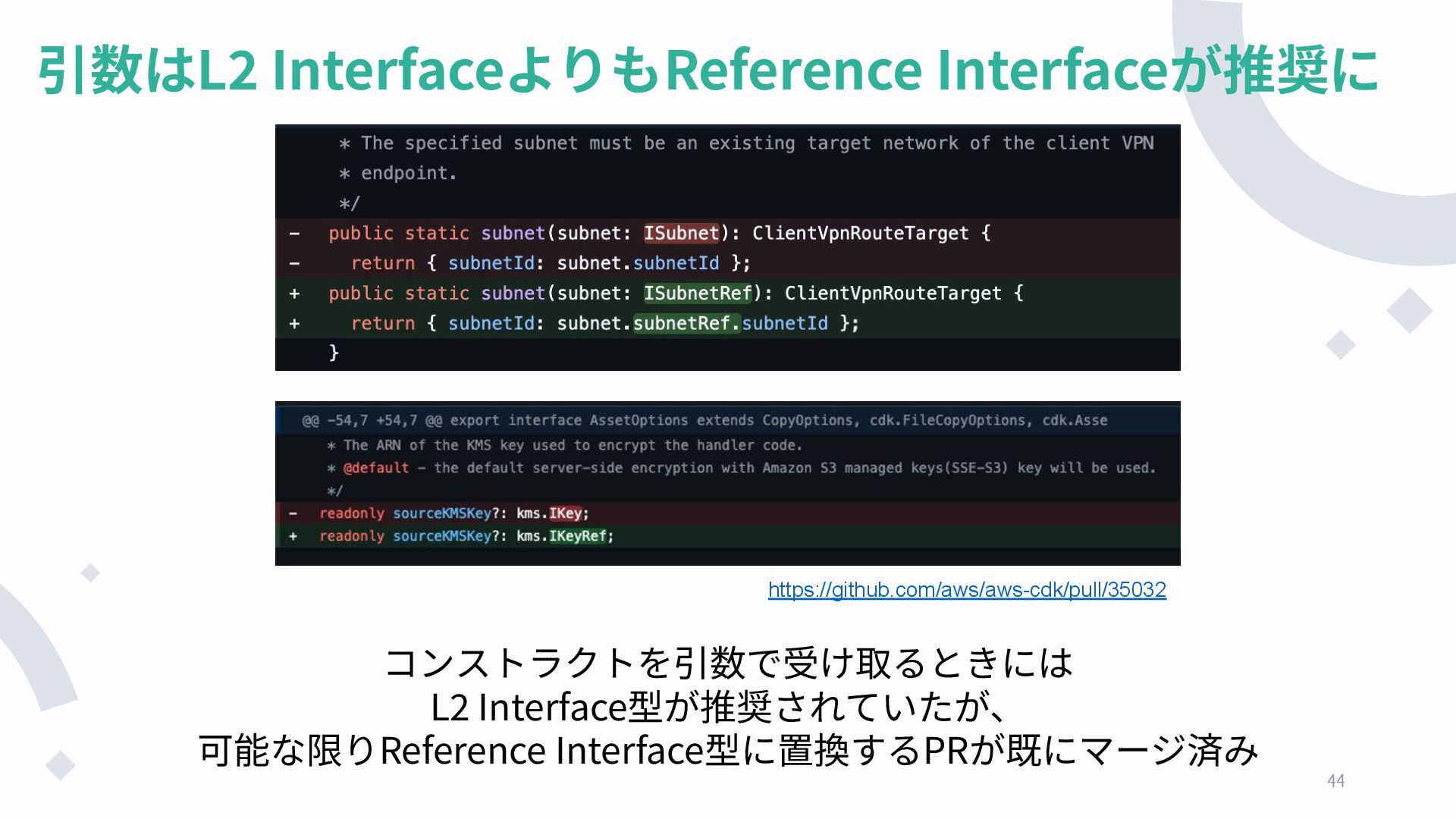 引数はL2 InterfaceよりもReference Interfaceが推奨に 44 https://github.com/aws/aws-cdk/pull/35032 コンストラクトを引数で受け取るときには L2 Interface型が推奨されていたが、 可能な限りReference Interface型に置換するPRが既にマージ済み