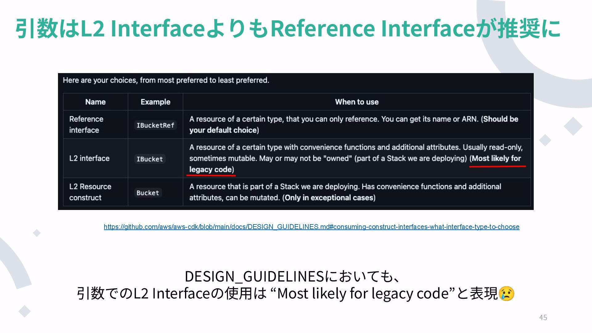 45 https://github.com/aws/aws-cdk/blob/main/docs/DESIGN_GUIDELINES.md#consuming-construct-interfaces-what-interface-type-to-choose DESIGN_GUIDELINESにおいても、 引数でのL2 Interfaceの使⽤は “Most likely for legacy code”と表現😢