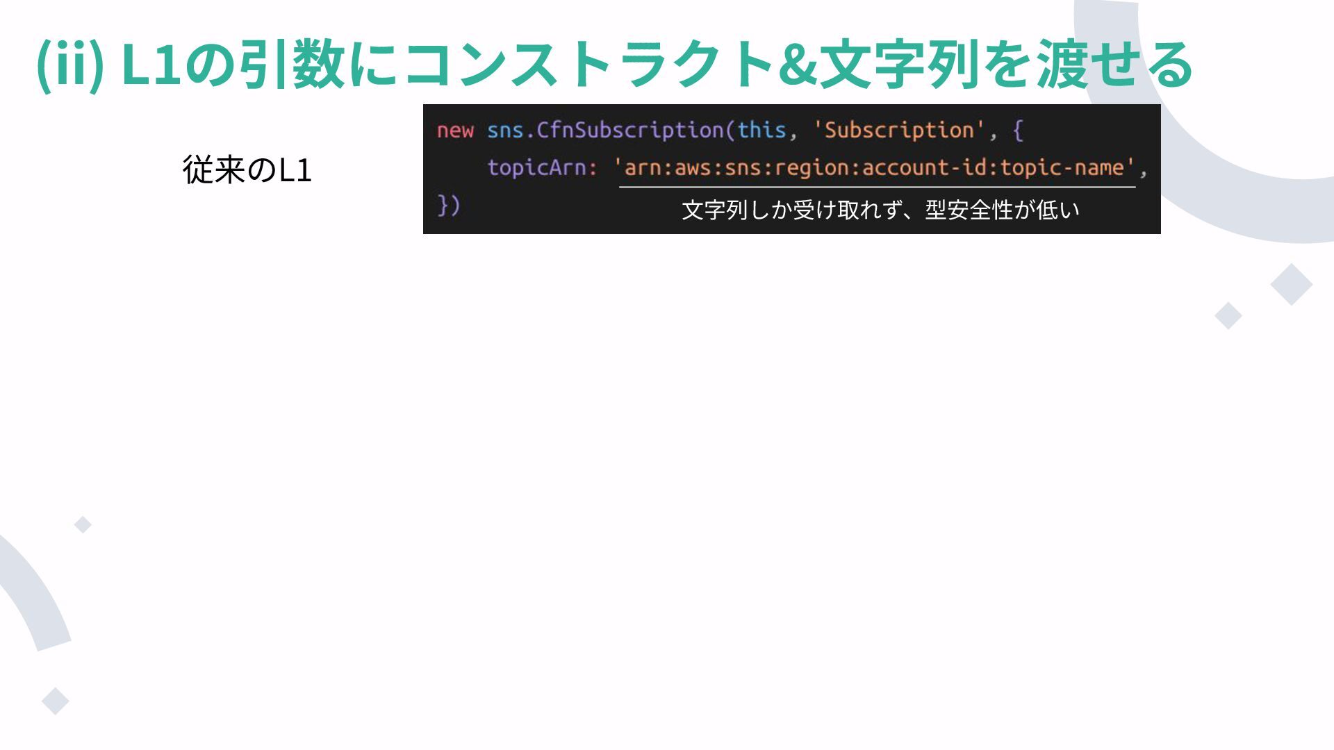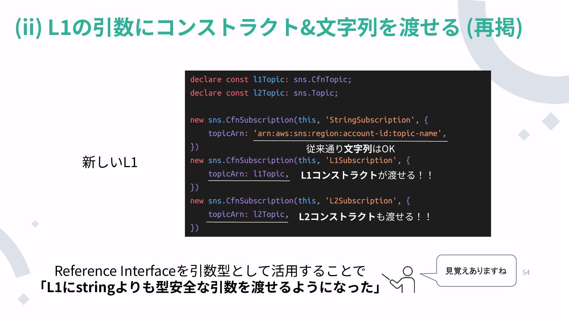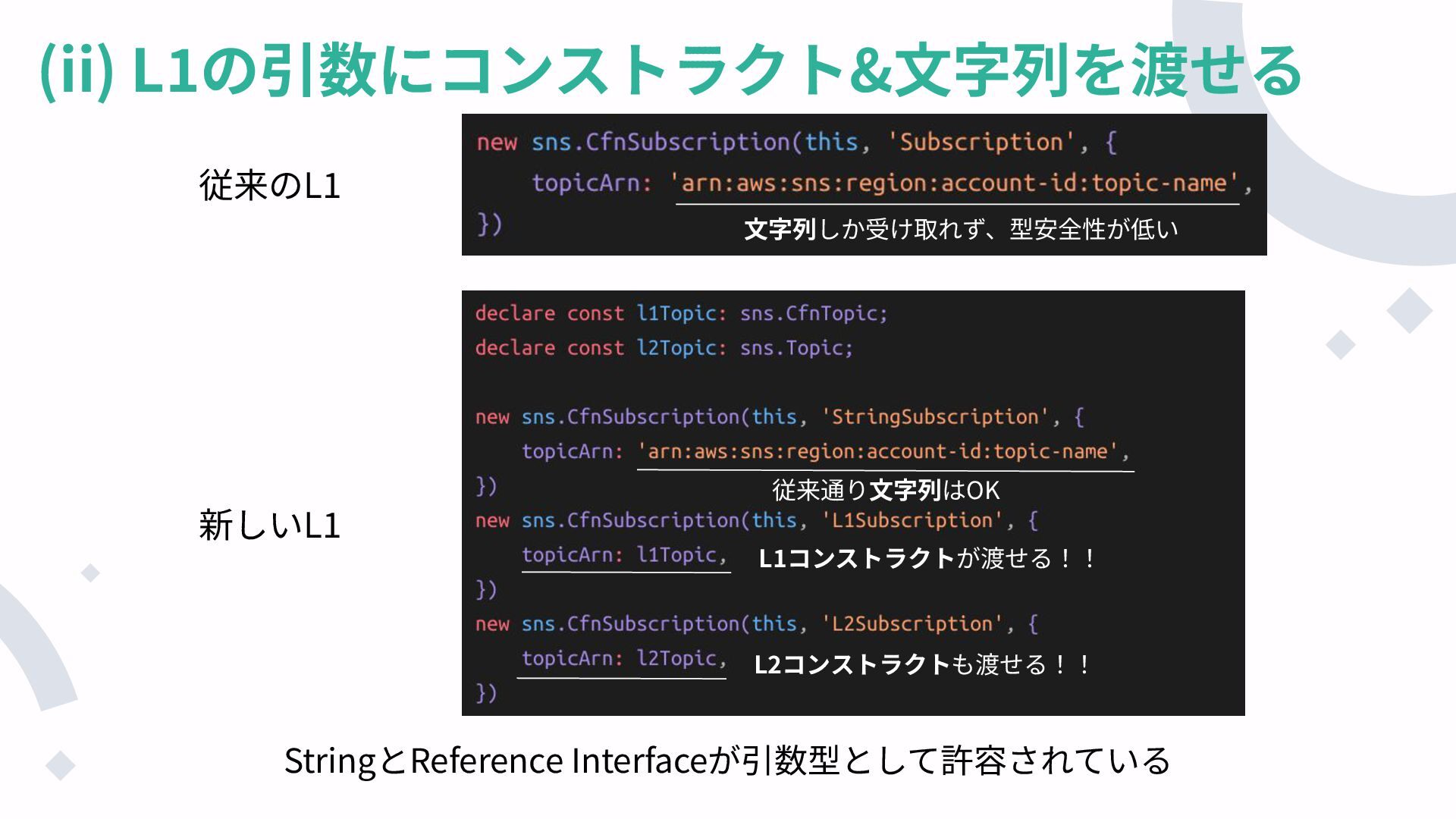 (ii) L1の引数にコンストラクト&⽂字列を渡せる 従来のL1 ⽂字列しか受け取れず、型安全性が低い 新しいL1 従来通り⽂字列はOK L1コンストラクトが渡せる!! L2コンストラクトも渡せる!! StringとReference Interfaceが引数型として許容されている