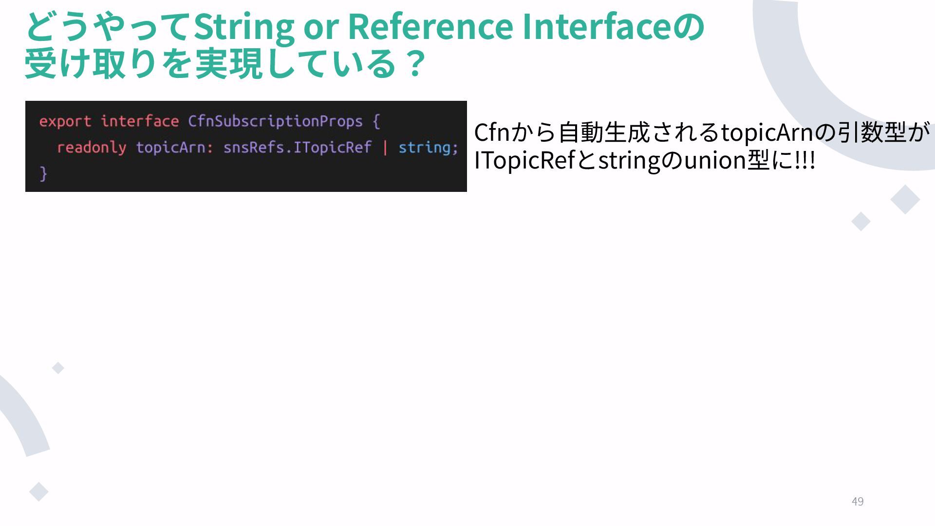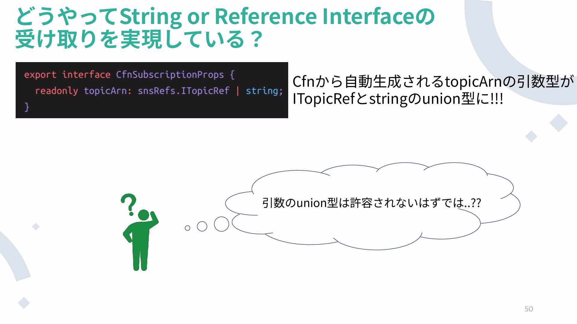 どうやってString or Reference Interfaceの 受け取りを実現している? 49 Cfnから⾃動⽣成されるtopicArnの引数型が ITopicRefとstringのunion型に!!!