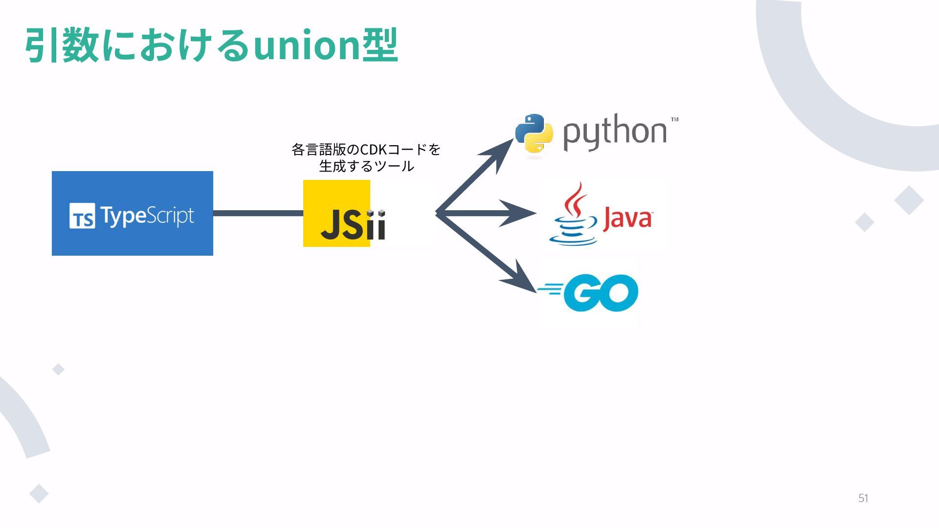 引数におけるunion型 51 各⾔語版のCDKコードを ⽣成するツール