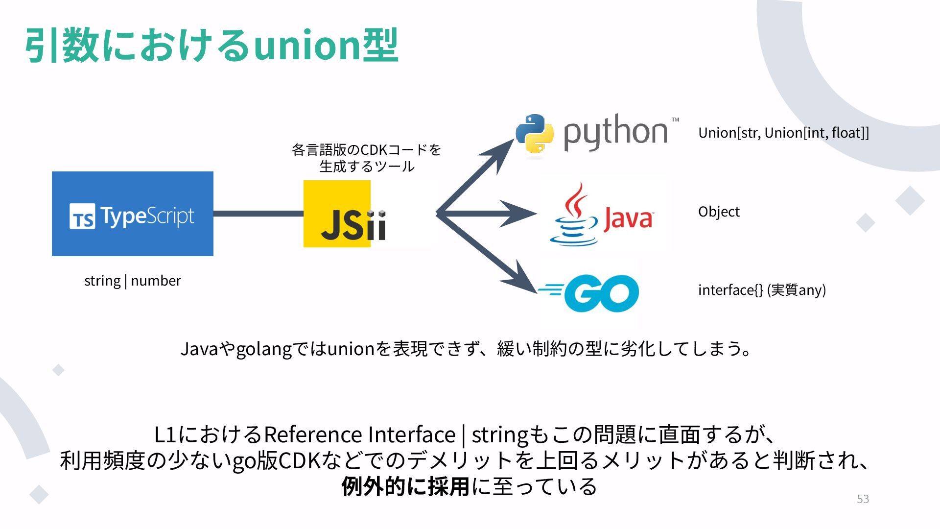 Object interface{} (実質any) Javaやgolangではunionを表現できず、緩い制約の型に劣化してしまう。 L1におけるReference Interface | stringもこの問題に直⾯するが、 利⽤頻度の少ないgo版CDKなどでのデメリットを上回るメリットがあると判断され、 例外的に採⽤に⾄っている