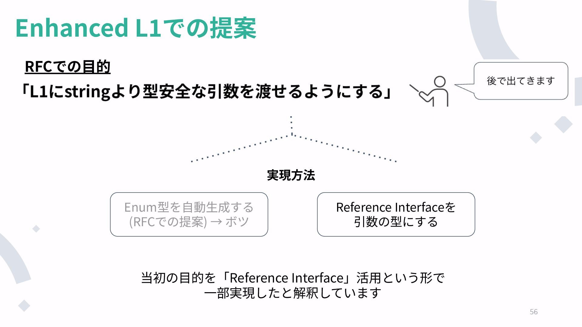 Enhanced L1での提案 56 Enum型を⾃動⽣成する (RFCでの提案) → ボツ 実現⽅法 Reference Interfaceを