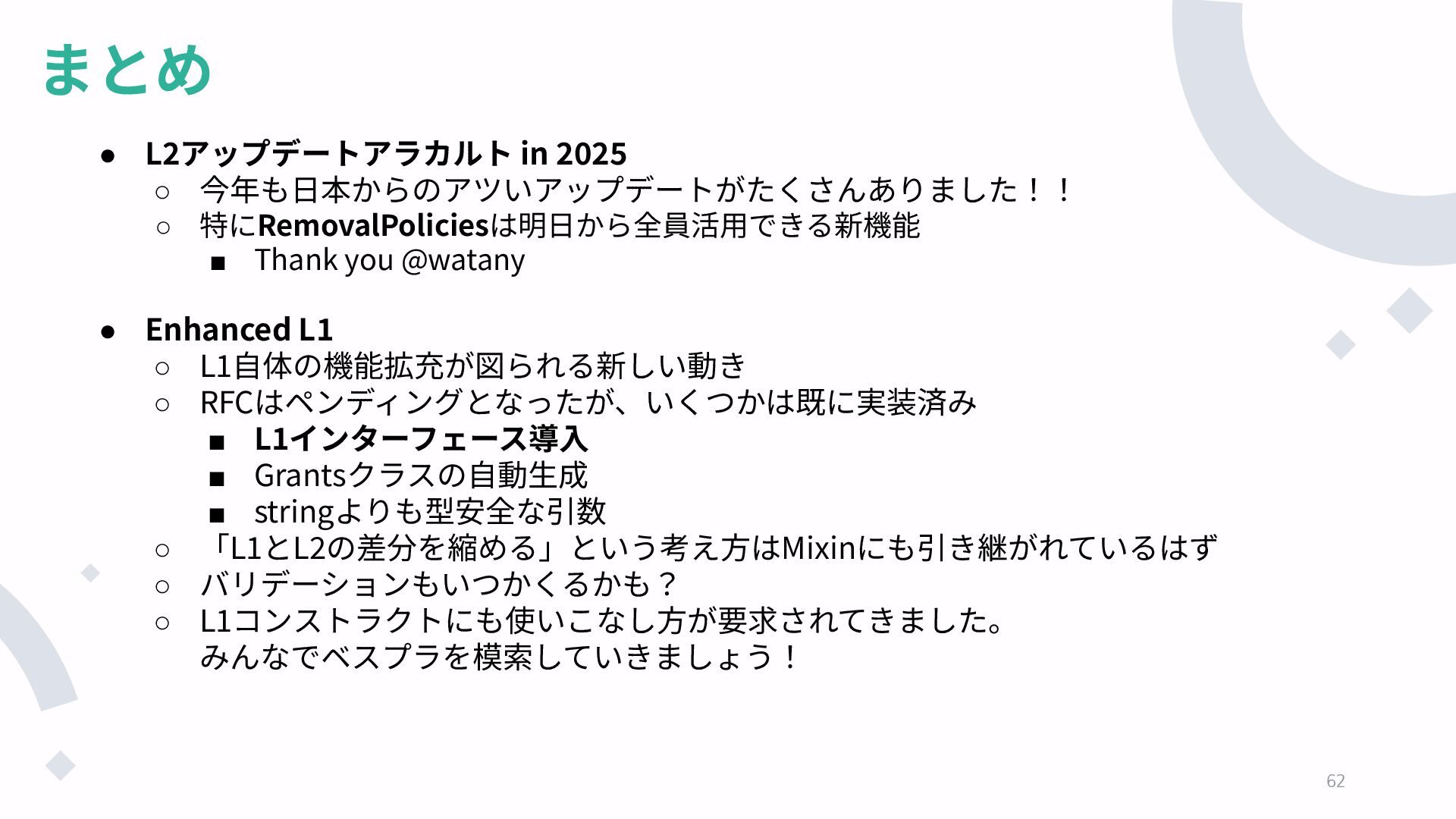 ▪ Thank you @watany • Enhanced L1 ◦ L1⾃体の機能拡充が図られる新しい動き ◦ RFCはペンディングとなったが、いくつかは既に実装済み ▪ L1インターフェース導⼊ ▪ Grantsクラスの⾃動⽣成 ▪ stringよりも型安全な引数 ◦ 「L1とL2の差分を縮める」という考え⽅はMixinにも引き継がれているはず ◦ バリデーションもいつかくるかも? ◦ L1コンストラクトにも使いこなし⽅が要求されてきました。 みんなでベスプラを模索していきましょう!