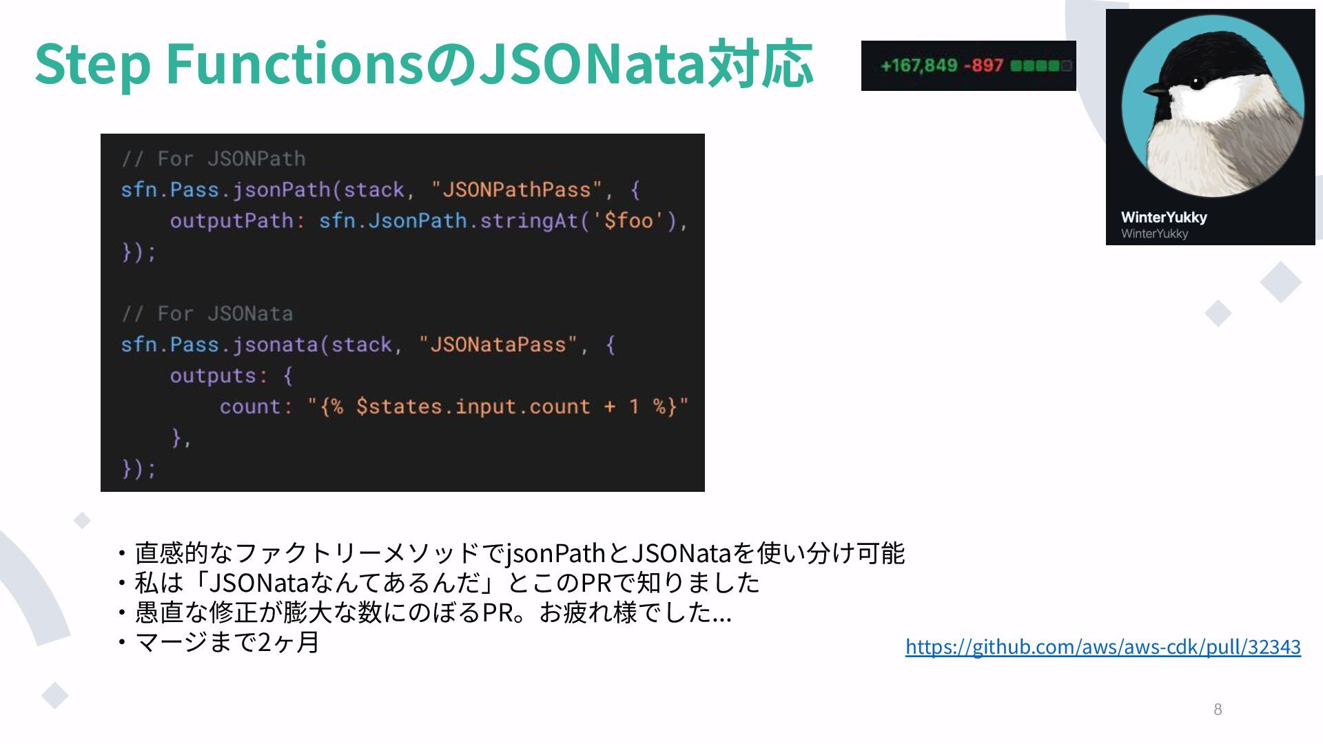 Step FunctionsのJSONata対応 8 https://github.com/aws/aws-cdk/pull/32343 ‧直感的なファクトリーメソッドでjsonPathとJSONataを使い分け可能 ‧私は「JSONataなんてあるんだ」とこのPRで知りました ‧愚直な修正が膨⼤な数にのぼるPR。お疲れ様でした... ‧マージまで2ヶ⽉
