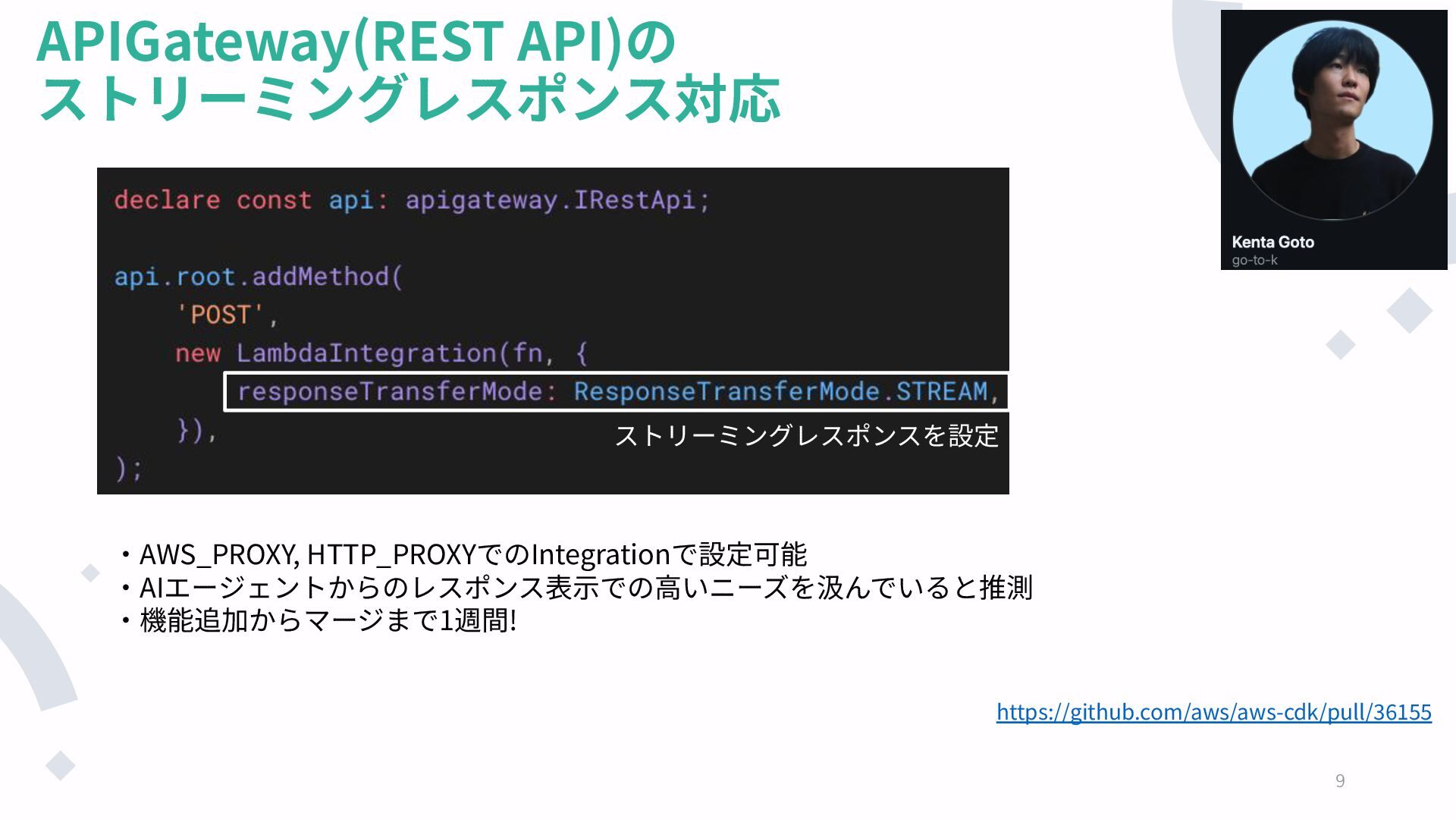APIGateway(REST API)の ストリーミングレスポンス対応 9 https://github.com/aws/aws-cdk/pull/36155 ‧AWS_PROXY, HTTP_PROXYでのIntegrationで設定可能 ‧AIエージェントからのレスポンス表⽰での⾼いニーズを汲んでいると推測 ‧機能追加からマージまで1週間! ストリーミングレスポンスを設定