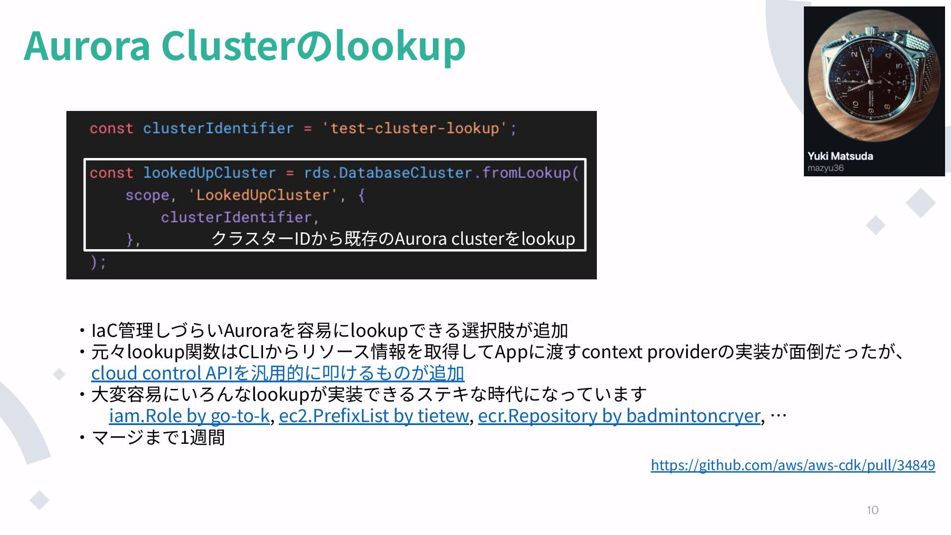 ‧⼤変容易にいろんなlookupが実装できるステキな時代になっています iam.Role by go-to-k, ec2.PrefixList by tietew, ecr.Repository by badmintoncryer, … ‧マージまで1週間 クラスターIDから既存のAurora clusterをlookup