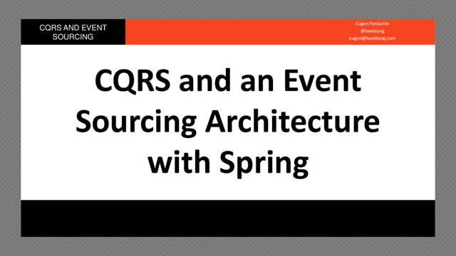 . . . . CQRS and Event Sourcing with Spring HI • My name is Eugen Paraschiv (don’t try to pronounce it) • Created my first Event Sourced Architecture in early 2014 • Got excited about CQRS and DDD • Working on my 4th real-world implementation now • Made lots of mistakes and learned from them • The current implementation is well positioned to become the largest ElasticSearch installation in the world