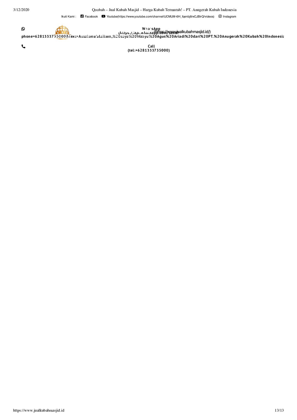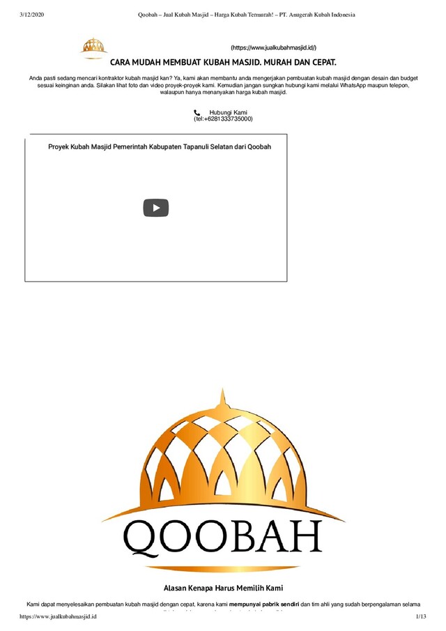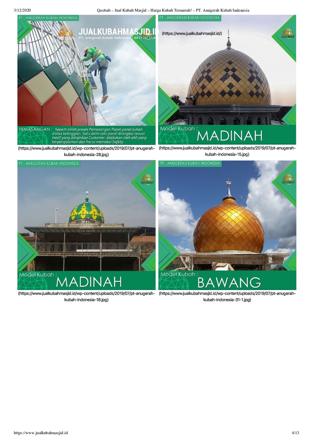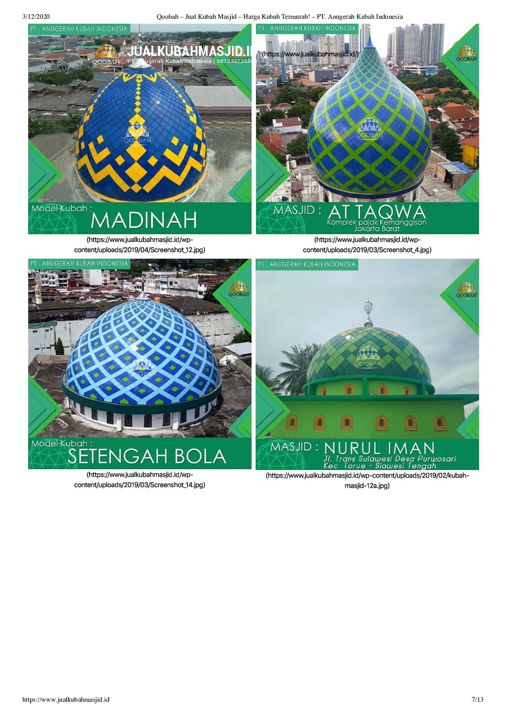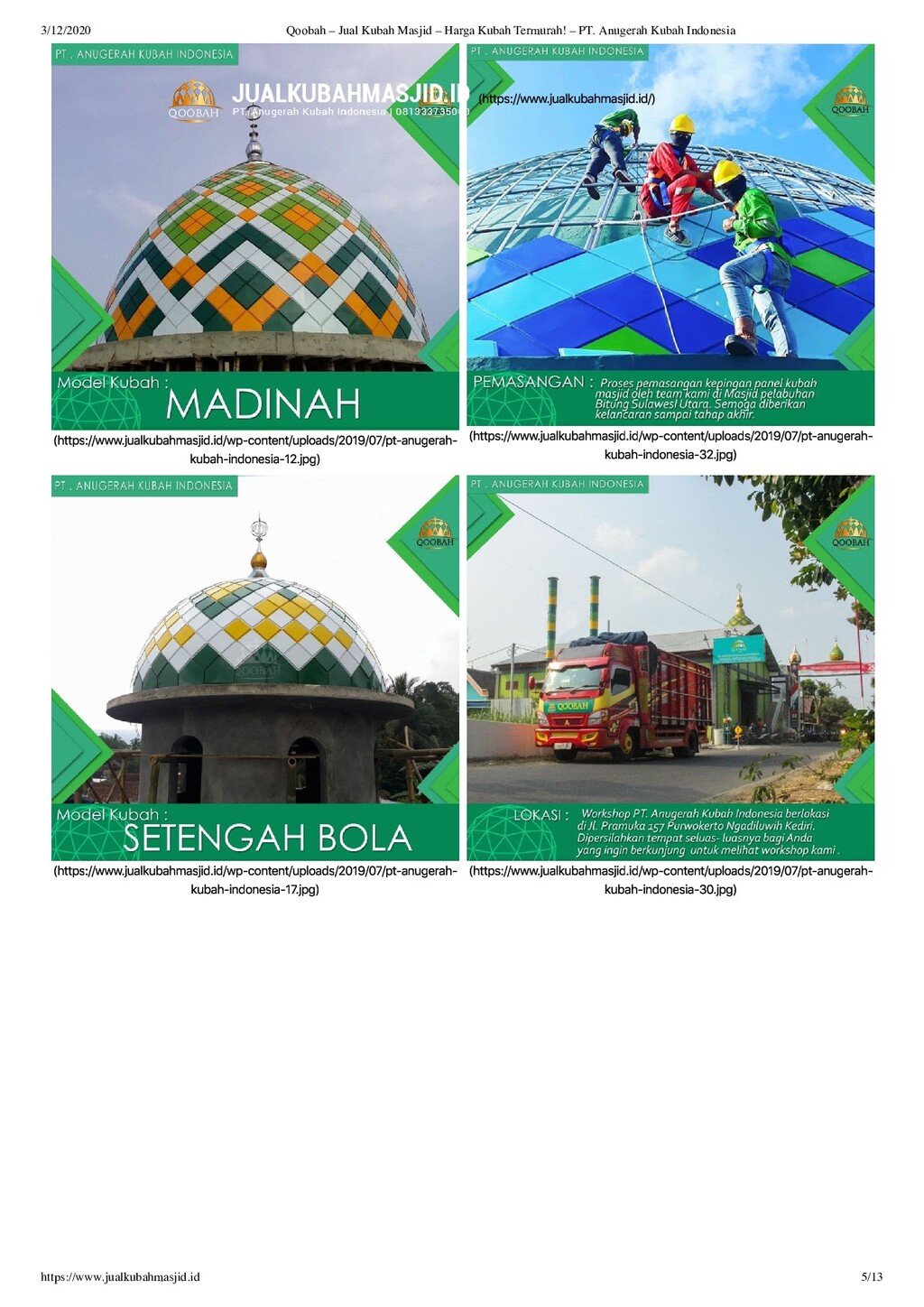 PT Anugerah Kubah Masjid memiliki brand Qoobah, adalah kontraktor kubah masjid terbaik di Indonesia. Lokasi pabrik kubah masjid kami berada di Jl. Pramuka 161, Ds. Purwokerto, Kec. Ngadiluwih, Kab. Kediri, Jawa Timur, Indonesia. Harga kubah masjid yang kami tawarkan sangat bersaing dan tentu berkualitas. Produk-produk kami yaitu Kubah Enamel, Kubah Masjid Galvalum, Kubah ACP, dan Kubah Masjid GRC dapat dilihat di sini.