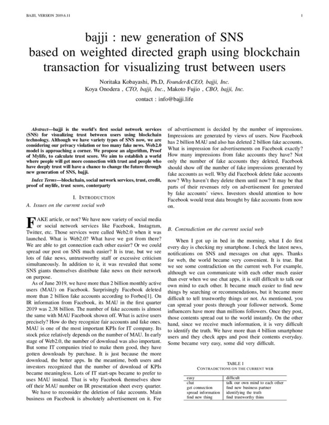 such contradiction is happening? Although we can contact easier and get information a lots, we feel it is still very difficult to tell a person/content we get to know is trustworthy or not based on much information we have. It is simply because all are free and unlimited. Registration accounts on SNS is free. Posting text, image, or even videos is free. Click like, share posts, retweet are all free. Also, it is unlimited. You can click like 1,000 times or more a day. Both getting followers and follows are unlimited. For example, if someone has more than 100,000 followers, we do not know whether he/she has really 100,000 funs or not. Out of 100,000 followers, he/she may have only 1,000 funs and rest of it might be anti-followers. It often happens. No one knows for a fact. For most of consumers, we think NES (Nintendo Entertain- ment System, Family computer) released in 1984 was the first computer. It became very popular worldwide rapidly. Super NES, Play Station (SONY) were released in 1990 and 1994, respectively. At that time, issues of software developments was limit of memory. ROM (Read only Memory) was very expensive. For example, the first RPG, Dragon Quest, released in 1986 was provided by only 64KB. It was amazingly just 64KB. If you take a photo on iPhone, one shot is larger than that. In 1995, we all recognize internet revolution by Windows95 and Yahoo!. So did we. Before those launches, most of us did not understand how to use Internet. In 1997, Google appeared. We had gotten a wing to fly Internet. But it was not easy. The only way to get connection with Internet was dial up. Its connection speed was only 28.8Kbps. Although internet is new generation of technology, all were inconvenient. The first broadband called ADLS (Asymmetric Digital Subscriber Line) was introduced by Yahoo! Japan, a group of SoftBank in 2001. They provided ADSL modem by free to consumer. Internet connection speed became fast to 2MB to 4MB. We may say that it was the first freemium economy on Internet. Simultaneously, CPU performance was improved for example, from 150MHz of Pentium in 1996 to 1.3GHz of Celeron in 2002. Gradually, we are able to do various things on Internet. In 2004, Facebook was released. No like button at the beginning absolutely. No function of posts, share, nor message. All users can do is only post one photo and input their occu- pation for example name, birthday, grades only. Facebook has released free function one by one in line with the development of Internet. In 2006, the word of Web2.0 was paid attention to. Its keyword was free. As of 2019, most of people think it is normal. It is surprising that posting text, photo, or video on social network services are free. If you post a single video, you would consume 10MB. Its size is similar with the size of 100 games on NES. Business model of Web2.0 players is advertisement model. First of all they need to gather users, views, and impressions. That is why they provide their services by free to get impressions more. In addition, they had to provide functions that users can not help but use. The first one was like button released in 2010 on Facebook. Since they need impressions more, users can click it unlimitedly. Most of all functions are free and unlimited. Is it good features of Web2.0 services. However, it is also harmful function ironically. It lead rapid expansion and social changes. Arab spring in 2010 was said to be brought by SNS. It also caused large amount of fake contents and excessive criticism. Web2.0 model is approaching a corner. We believe that it is time to re-build the current social web. We have an idea to solve these issues. It is bajji. II. SERVICE CONCEPT OF BAJJI A. Visualization of trust BAJJI is a new generation of SNS using blockchain technology. What we are trying to do is visualize trust between people. For the last five years, variety of C2C services like Uber, Airbnb and Mercari have been appeared. We become to be able to select someone we do not know on those platform. Why we could choose someone? On Uber, it sounds dangerous you can take a ride on a car which driver you do not know. You can stay somewhere even though you do not meet with its host. Why we could select unknown person? It is because we see rating. You just check its rating. On such apps, rating of drivers, hosts, or providers are disclosed. When you take a cab on Uber, you do not see drivers basically. What you see is only rating. It is just number. Once you get off the car, you can not tell name of the driver any more. Rating is a kind of credit. Credit is built by past perfor- mance. Most of all C2C services rely on rating. One says that we entered big data era. However, no data regarding to trust is stored yet. Trust is built by reputation or expectation gained from family, friends, or colleagues. It is also established by honest behavior. Once such trust data of each person is stacked one by one on SNS, we never see fake news nor excessive criticism. Visualization of trust will lead to solve big issues on the current social web. Since one’s trust is built by others, visualization of trust would be deterrent to go wrong. bajji is named after a badge which is symbol of trust. A badge is used for lawyer, police, and member of parliament etc. Our service concept is giving bajji as symbol of your trust to someone you would like to convey your mind or sympathy. Its transaction is recorded on blockchain which will be never tampered. Important thing is that bajji is limited. It is not free nor unlimited. New users on bajji will receive 30 (to be fixed) bajji only first. Since it is limited, users have to consider to use it. As a result, the number of bajji you received will stand for your trust from others. B. Backgrounds of designing bajji services Our vision for bajji is building trust-based world through blockchain technology and providing innovative services to TABLE II CREDIT AND TRUST Credit Trust Honestly rating Reputation Expectation
