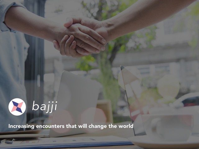beta released In Japanese version bajji Store opened Sep 2019 Official Japanese version release • Basic function • Record encounter • Give and receive free universal bajji • Buy bajjis • Give and receive bajjis with various feelings 2020 bajji collaborative community place open • Verify profile and validate bajji-score • Get reward depending on the amount of activity • Awesome things happen by bajji innovators every day Increasing encounters that will change the world Oct 2019 Will launch for worldwide • Innovation happens everywhere CLEAR CLEAR