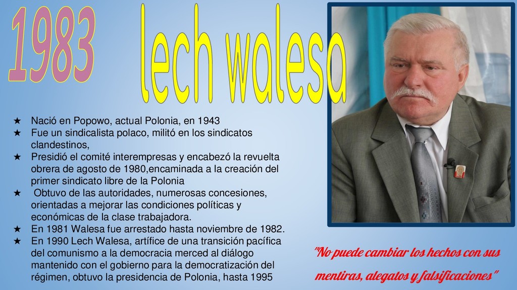un sindicalista polaco, militó en los sindicatos clandestinos, ★ Presidió el comité interempresas y encabezó la revuelta obrera de agosto de 1980,encaminada a la creación del primer sindicato libre de la Polonia ★ Obtuvo de las autoridades, numerosas concesiones, orientadas a mejorar las condiciones políticas y económicas de la clase trabajadora. ★ En 1981 Walesa fue arrestado hasta noviembre de 1982. ★ En 1990 Lech Walesa, artífice de una transición pacífica del comunismo a la democracia merced al diálogo mantenido con el gobierno para la democratización del régimen, obtuvo la presidencia de Polonia, hasta 1995 "No puede cambiar los hechos con sus mentiras, alegatos y falsificaciones"