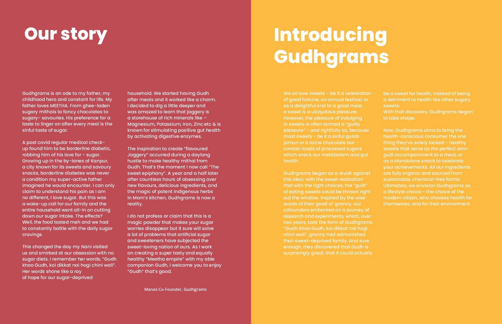 to my father, my childhood hero and constant for life. My father loves MEETHA. From ghee-laden sugary mithais to fancy chocolates to sugary- savouries. His preference for a taste to linger on after every meal is the sinful taste of sugar. A post covid regular medical check- up found him to be borderline diabetic, robbing him of his love for - sugar. Growing up in the by-lanes of Kanpur, a city known for its sweets and savoury snacks, borderline diabetes was never a condition my super-active father imagined he would encounter. I can only claim to understand his pain as I am no different, I love sugar. But this was a wake-up call for our family and the entire household went all-in on cutting down our sugar intake. The effects? Well, the food tasted meh and we had to constantly battle with the daily sugar cravings. This changed the day my Nani visited us and smirked at our obsession with no sugar diets. I remember her words, “Gudh khao Gudh, koi dikkat nai hogi chini wali”. Her words shone like a ray of hope for our sugar-deprived household. We started having Gudh after meals and it worked like a charm. I decided to dig a little deeper and was amazed to learn that jaggery is a storehouse of rich minerals like – Magnesium, Potassium, Iron, Zinc etc & is known for stimulating positive gut health by activating digestive enzymes. The inspiration to create “flavoured Jaggery” occurred during a daylong hustle to make healthy mithai from Gudh. That’s the moment I now call “The sweet epiphany”. A year and a half later after countless hours of obsessing over new flavours, delicious ingredients, and the magic of potent indigenous herbs in Mom’s kitchen, Gudhgrams is now a reality. I do not profess or claim that this is a magic powder that makes your sugar worries disappear but it sure will solve a lot of problems that artificial sugar and sweeteners have subjected the sweet-loving nation of ours. As I work on creating a super tasty and equally healthy “Meetha empire” with my able companion Gudh, I welcome you to enjoy “Gudh” that’s good. We all love sweets - be it a celebration of good fortune, an annual festival, or as a delightful end to a good meal, a sweet is a ubiquitous pleasure. However, the pleasure of indulging in sweets is often termed a “guilty pleasure” - and rightfully so, because most sweets - be it a sinful gulab jamun or a tame chocolate bar - contain loads of processed sugars which wreck our metabolism and gut health. Gudhgrams began as a revolt against this idea; with the sweet realization that with the right choices, the “guilt” of eating sweets could be thrown right out the window. Inspired by the wise words of their good ol’ granny, our cofounders embarked on a journey of research and experiments, which, over two years, took the form of Gudhgrams. “Gudh khao Gudh, koi dikkat nai hogi chini wali”, granny had admonished their sweet-deprived family. And sure enough, they discovered that Gudh is surprisingly good; that it could actually be a sweet for health, instead of being a detriment to health like other sugary sweets. With that discovery, Gudhgrams began to take shape. Now, Gudhgrams aims to bring the health-conscious consumer the one thing they’ve sorely lacked - healthy sweets that serve as the perfect zero- guilt accompaniment to a meal, or as a standalone snack to celebrate your achievements. All our ingredients are fully organic and sourced from sustainable, chemical-free farms. Ultimately, we envision Gudhgrams as a lifestyle choice - the choice of the modern citizen, who chooses health for themselves, and for their environment. Manas Co-Founder, Gudhgrams