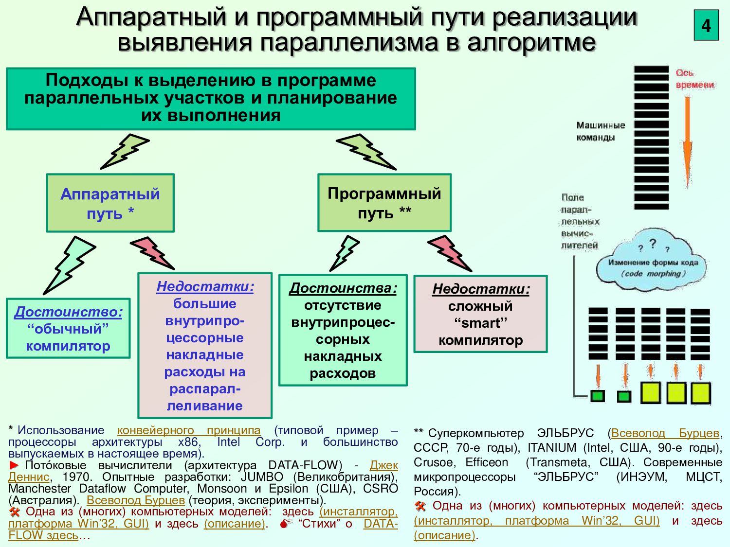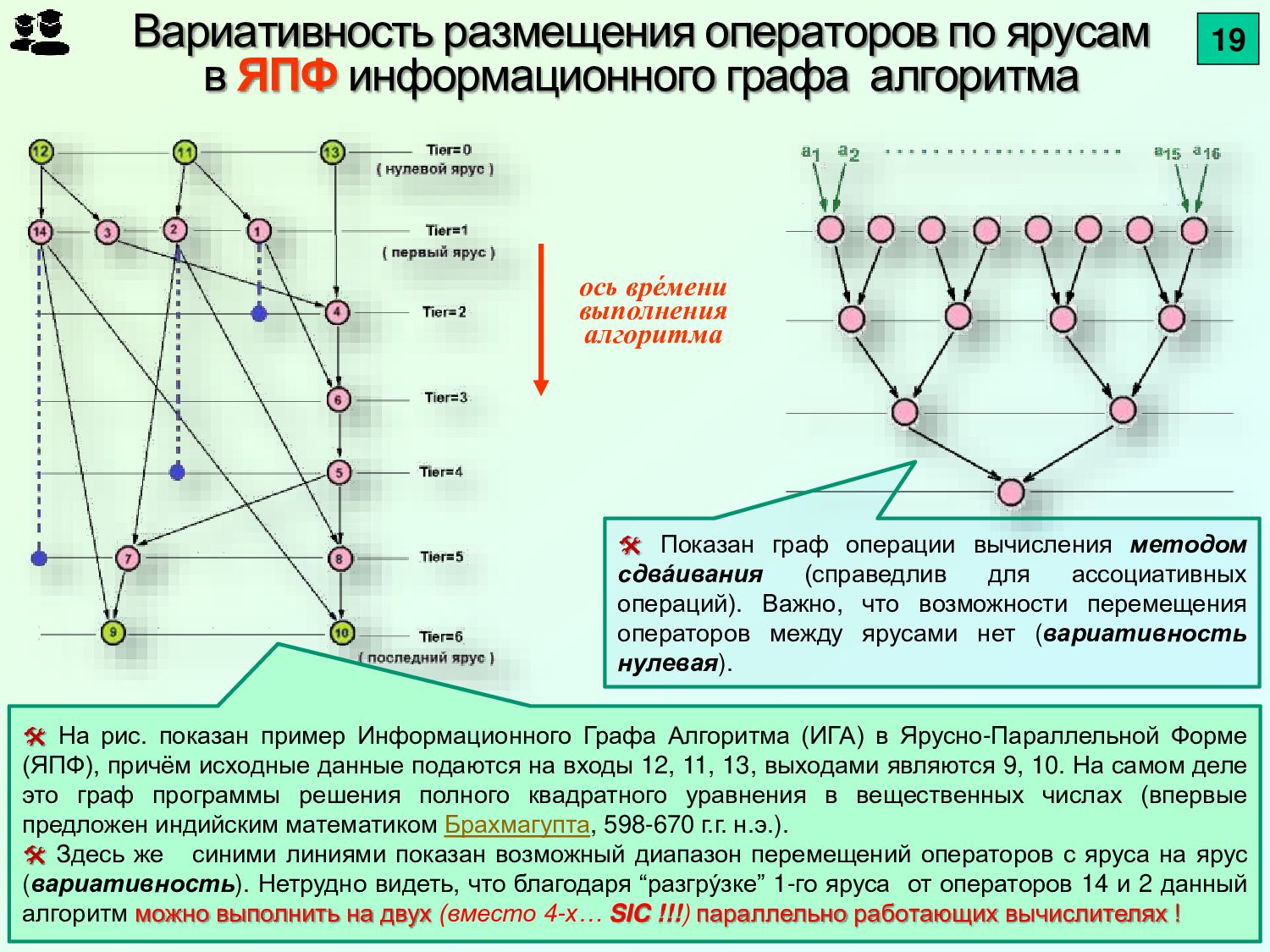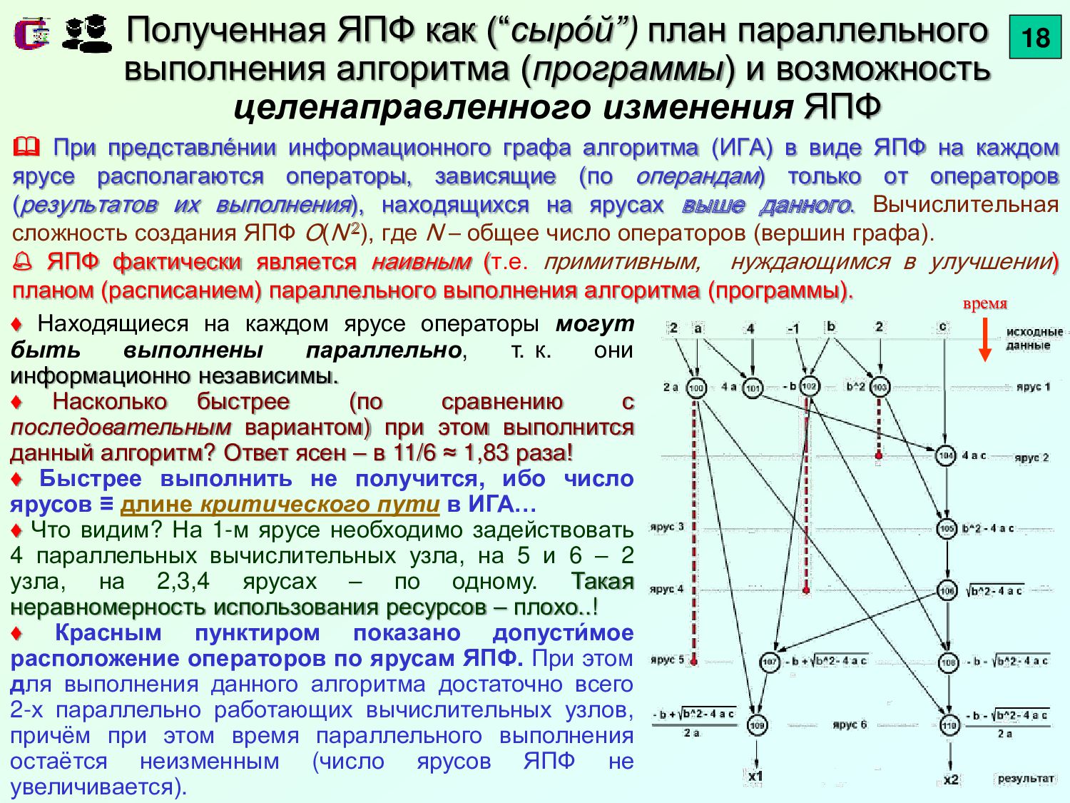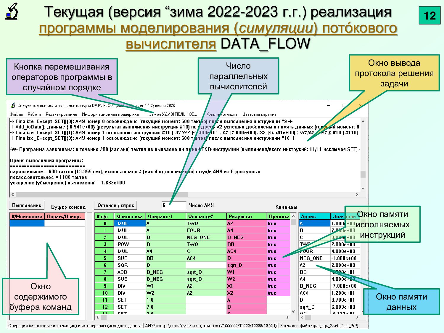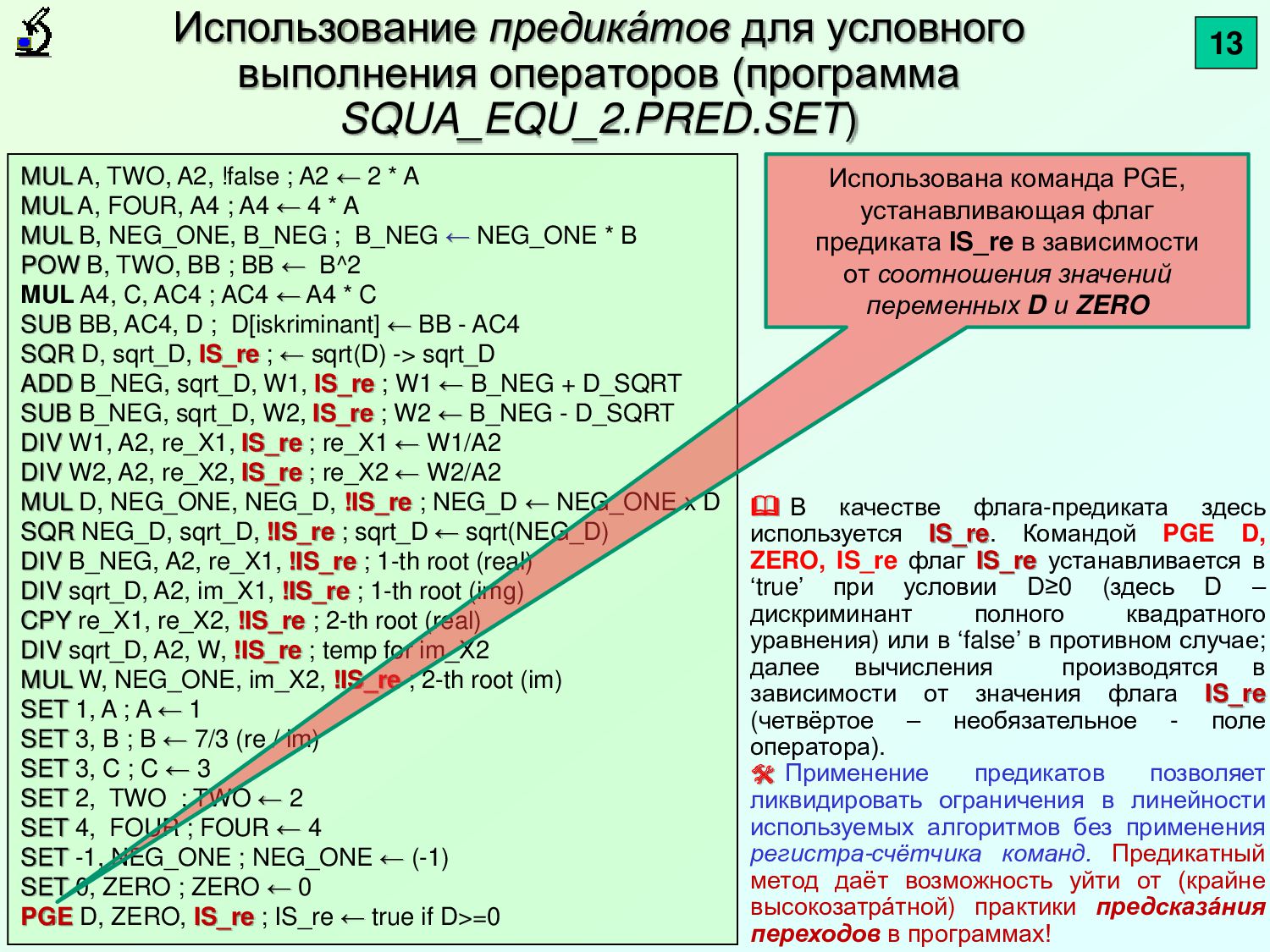 A, TWO, A2, !false ; A2 ← 2 * A MUL A, FOUR, A4 ; A4 ← 4 * A MUL B, NEG_ONE, B_NEG ; B_NEG ← NEG_ONE * B POW B, TWO, BB ; BB ← B^2 MUL A4, C, AC4 ; AC4 ← A4 * C SUB BB, AC4, D ; D[iskriminant] ← BB - AC4 SQR D, sqrt_D, IS_re ; ← sqrt(D) -> sqrt_D ADD B_NEG, sqrt_D, W1, IS_re ; W1 ← B_NEG + D_SQRT SUB B_NEG, sqrt_D, W2, IS_re ; W2 ← B_NEG - D_SQRT DIV W1, A2, re_X1, IS_re ; re_X1 ← W1/A2 DIV W2, A2, re_X2, IS_re ; re_X2 ← W2/A2 MUL D, NEG_ONE, NEG_D, !IS_re ; NEG_D ← NEG_ONE x D SQR NEG_D, sqrt_D, !IS_re ; sqrt_D ← sqrt(NEG_D) DIV B_NEG, A2, re_X1, !IS_re ; 1-th root (real) DIV sqrt_D, A2, im_X1, !IS_re ; 1-th root (img) CPY re_X1, re_X2, !IS_re ; 2-th root (real) DIV sqrt_D, A2, W, !IS_re ; temp for im_X2 MUL W, NEG_ONE, im_X2, !IS_re ; 2-th root (im) SET 1, A ; A ← 1 SET 3, B ; B ← 7/3 (re / im) SET 3, C ; C ← 3 SET 2, TWO ; TWO ← 2 SET 4, FOUR ; FOUR ← 4 SET -1, NEG_ONE ; NEG_ONE ← (-1) SET 0, ZERO ; ZERO ← 0 PGE D, ZERO, IS_re ; IS_re ← true if D>=0 13 Использована команда PGE, устанавливающая флаг предиката IS_re в зависимости от соотношения значений переменных D и ZERO В качестве флага-предиката здесь используется IS_re. Командой PGE D, ZERO, IS_re флаг IS_re устанавливается в ‘true’ при условии D≥0 (здесь D – дискриминант полного квадратного уравнения) или в ‘false’ в противном случае; далее вычисления производятся в зависимости от значения флага IS_re (четвёртое – необязательное - поле оператора). Применение предикатов позволяет ликвидировать ограничения в линейности используемых алгоритмов без применения регистра-счётчика команд. Предикатный метод даёт возможность уйти от (крайне высокозатра́тной) практики предсказа́ ния переходов в программах!