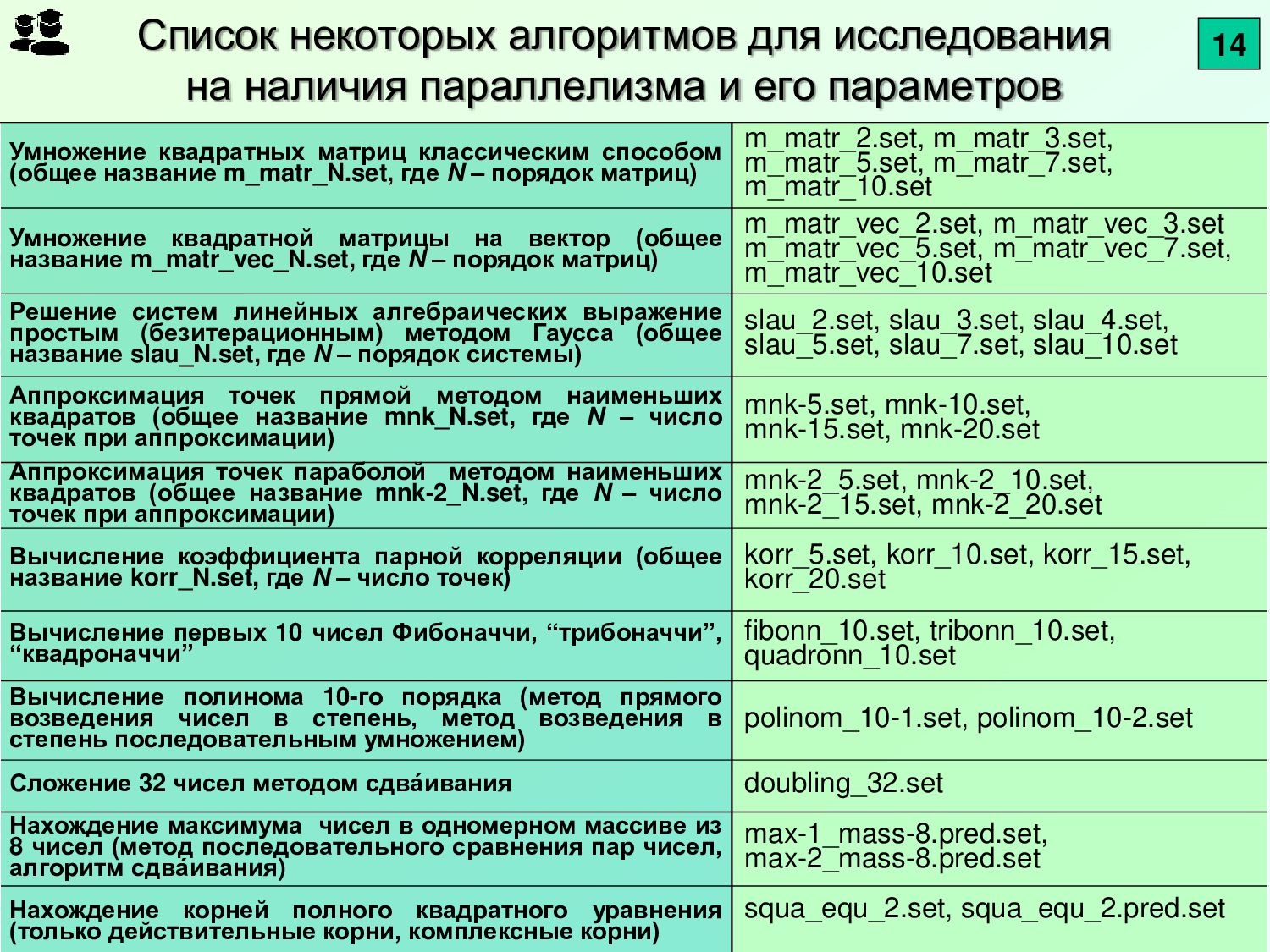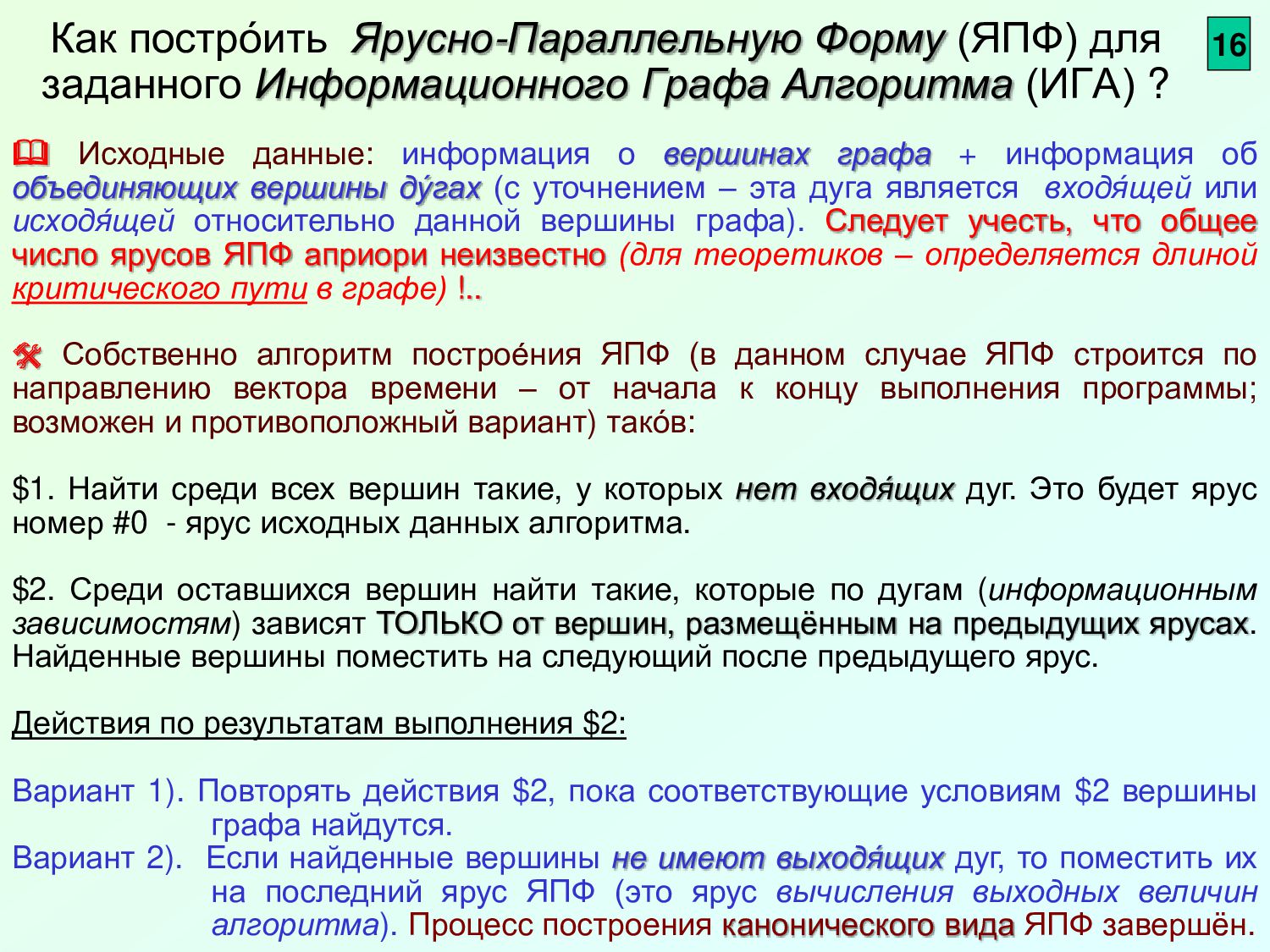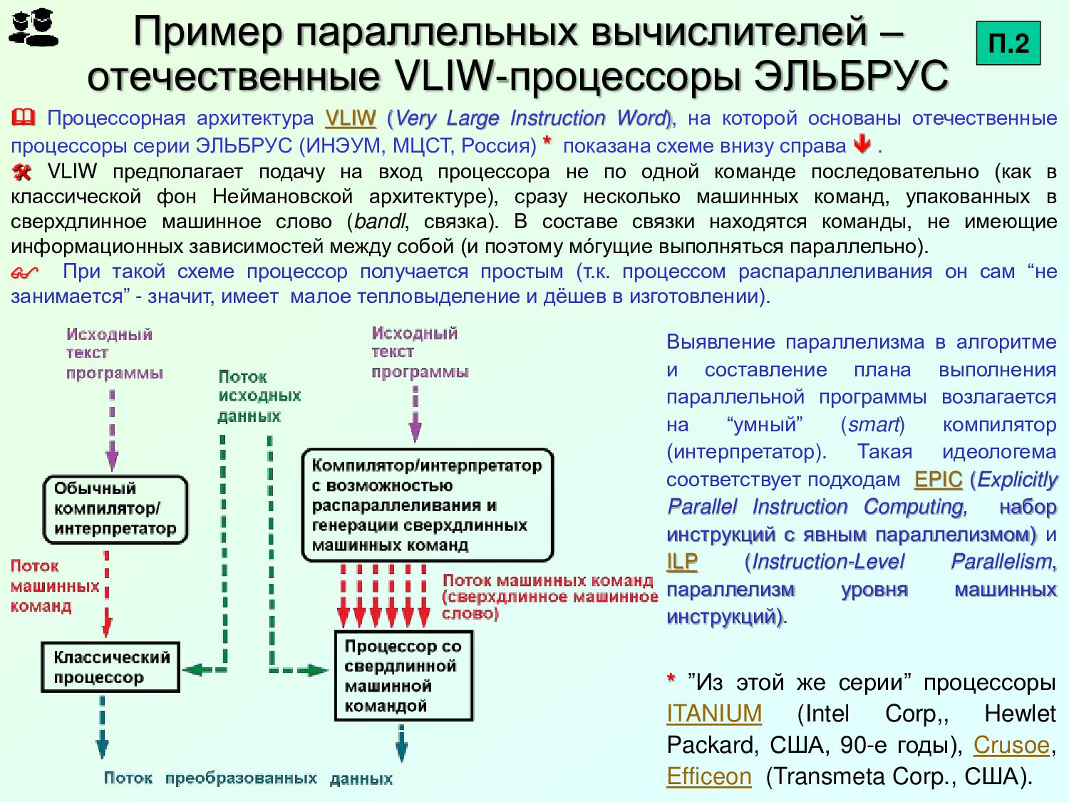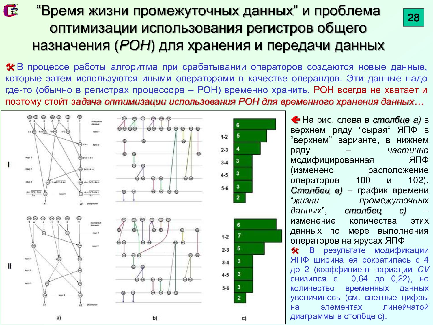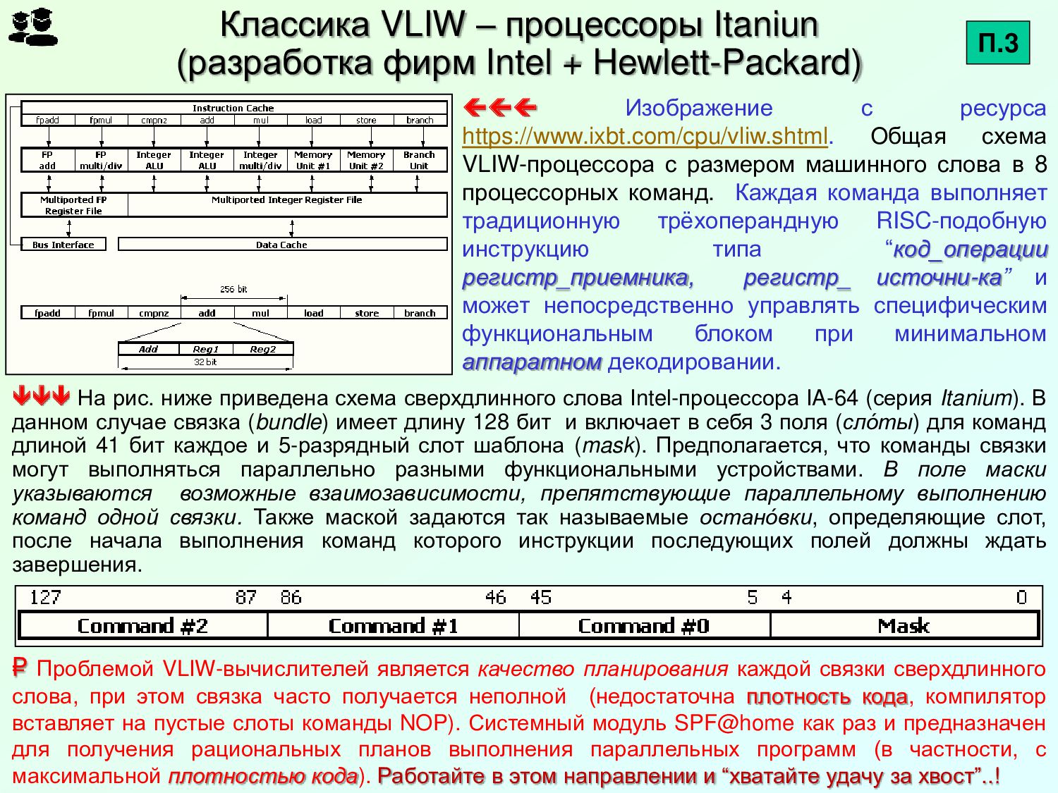A, TWO, A2, !false ; A2 ← 2 * A MUL A, FOUR, A4 ; A4 ← 4 * A MUL B, NEG_ONE, B_NEG ; B_NEG ← NEG_ONE * B POW B, TWO, BB ; BB ← B^2 MUL A4, C, AC4 ; AC4 ← A4 * C SUB BB, AC4, D ; D[iskriminant] ← BB - AC4 SQR D, sqrt_D, IS_re ; ← sqrt(D) -> sqrt_D ADD B_NEG, sqrt_D, W1, IS_re ; W1 ← B_NEG + D_SQRT SUB B_NEG, sqrt_D, W2, IS_re ; W2 ← B_NEG - D_SQRT DIV W1, A2, re_X1, IS_re ; re_X1 ← W1/A2 DIV W2, A2, re_X2, IS_re ; re_X2 ← W2/A2 MUL D, NEG_ONE, NEG_D, !IS_re ; NEG_D ← NEG_ONE x D SQR NEG_D, sqrt_D, !IS_re ; sqrt_D ← sqrt(NEG_D) DIV B_NEG, A2, re_X1, !IS_re ; 1-th root (real) DIV sqrt_D, A2, im_X1, !IS_re ; 1-th root (img) CPY re_X1, re_X2, !IS_re ; 2-th root (real) DIV sqrt_D, A2, W, !IS_re ; temp for im_X2 MUL W, NEG_ONE, im_X2, !IS_re ; 2-th root (im) SET 1, A ; A ← 1 SET 3, B ; B ← 7/3 (re / im) SET 3, C ; C ← 3 SET 2, TWO ; TWO ← 2 SET 4, FOUR ; FOUR ← 4 SET -1, NEG_ONE ; NEG_ONE ← (-1) SET 0, ZERO ; ZERO ← 0 PGE D, ZERO, IS_re ; IS_re ← true if D>=0 13 Использована команда PGE, устанавливающая флаг предиката IS_re в зависимости от соотношения значений переменных D и ZERO В качестве флага-предиката здесь используется IS_re. Командой PGE D, ZERO, IS_re флаг IS_re устанавливается в ‘true’ при условии D≥0 (здесь D – дискриминант полного квадратного уравнения) или в ‘false’ в противном случае; далее вычисления производятся в зависимости от значения флага IS_re (четвёртое – необязательное - поле оператора). Применение предикатов позволяет ликвидировать ограничения в линейности используемых алгоритмов без применения регистра-счётчика команд. Предикатный метод даёт возможность уйти от (крайне высокозатра́тной) практики предсказа́ ния переходов в программах!