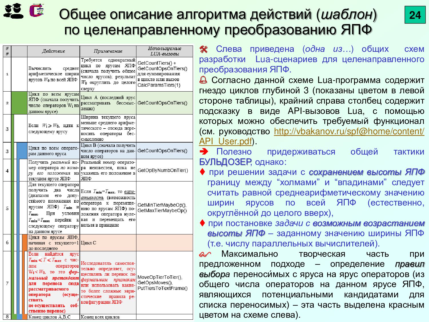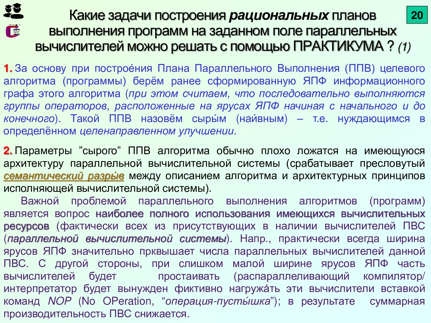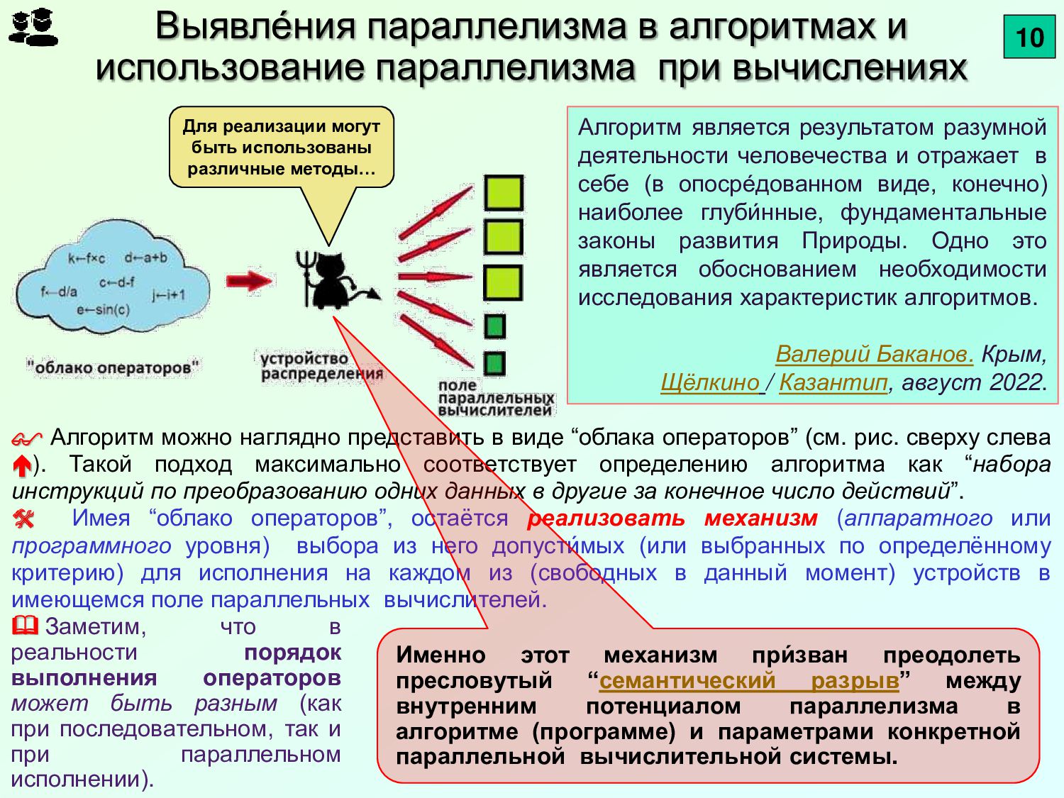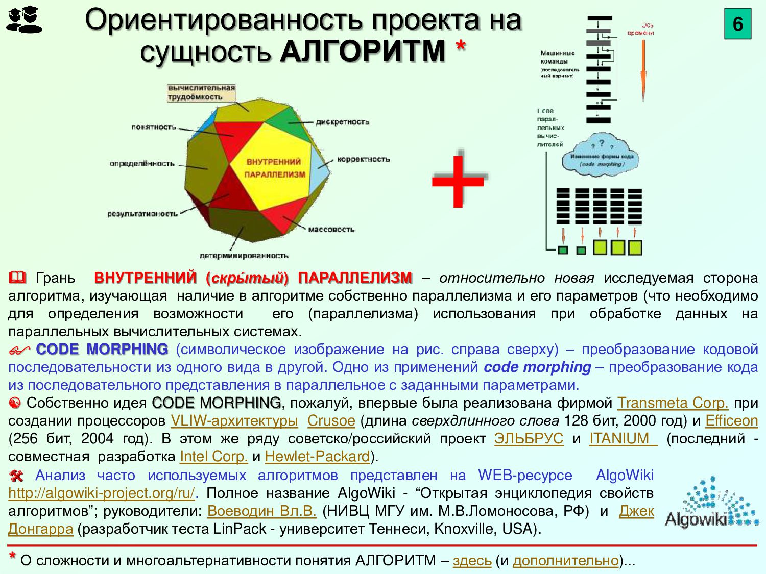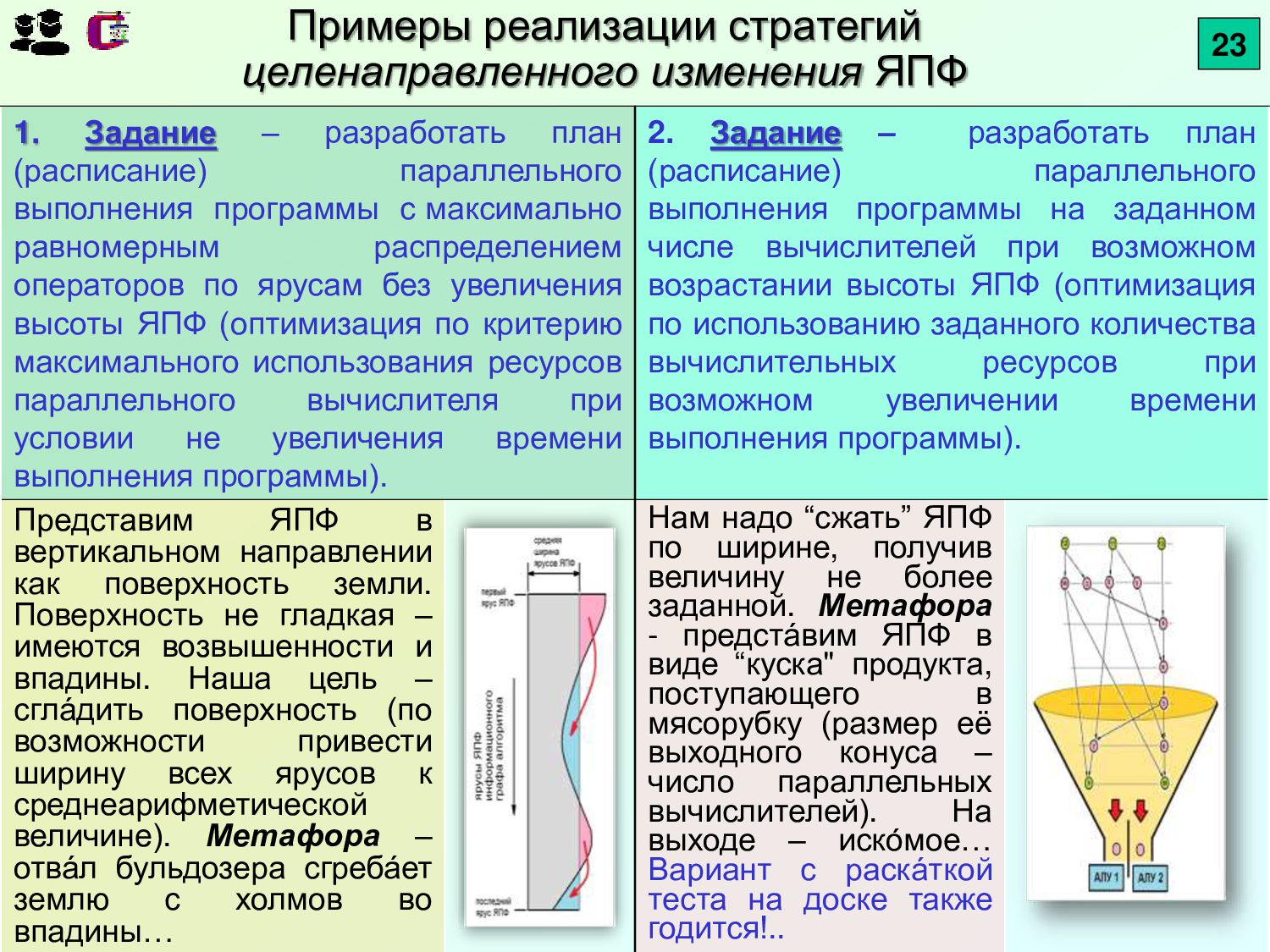 A, TWO, A2, !false ; A2 ← 2 * A MUL A, FOUR, A4 ; A4 ← 4 * A MUL B, NEG_ONE, B_NEG ; B_NEG ← NEG_ONE * B POW B, TWO, BB ; BB ← B^2 MUL A4, C, AC4 ; AC4 ← A4 * C SUB BB, AC4, D ; D[iskriminant] ← BB - AC4 SQR D, sqrt_D, IS_re ; ← sqrt(D) -> sqrt_D ADD B_NEG, sqrt_D, W1, IS_re ; W1 ← B_NEG + D_SQRT SUB B_NEG, sqrt_D, W2, IS_re ; W2 ← B_NEG - D_SQRT DIV W1, A2, re_X1, IS_re ; re_X1 ← W1/A2 DIV W2, A2, re_X2, IS_re ; re_X2 ← W2/A2 MUL D, NEG_ONE, NEG_D, !IS_re ; NEG_D ← NEG_ONE x D SQR NEG_D, sqrt_D, !IS_re ; sqrt_D ← sqrt(NEG_D) DIV B_NEG, A2, re_X1, !IS_re ; 1-th root (real) DIV sqrt_D, A2, im_X1, !IS_re ; 1-th root (img) CPY re_X1, re_X2, !IS_re ; 2-th root (real) DIV sqrt_D, A2, W, !IS_re ; temp for im_X2 MUL W, NEG_ONE, im_X2, !IS_re ; 2-th root (im) SET 1, A ; A ← 1 SET 3, B ; B ← 7/3 (re / im) SET 3, C ; C ← 3 SET 2, TWO ; TWO ← 2 SET 4, FOUR ; FOUR ← 4 SET -1, NEG_ONE ; NEG_ONE ← (-1) SET 0, ZERO ; ZERO ← 0 PGE D, ZERO, IS_re ; IS_re ← true if D>=0 13 Использована команда PGE, устанавливающая флаг предиката IS_re в зависимости от соотношения значений переменных D и ZERO В качестве флага-предиката здесь используется IS_re. Командой PGE D, ZERO, IS_re флаг IS_re устанавливается в ‘true’ при условии D≥0 (здесь D – дискриминант полного квадратного уравнения) или в ‘false’ в противном случае; далее вычисления производятся в зависимости от значения флага IS_re (четвёртое – необязательное - поле оператора). Применение предикатов позволяет ликвидировать ограничения в линейности используемых алгоритмов без применения регистра-счётчика команд. Предикатный метод даёт возможность уйти от (крайне высокозатра́тной) практики предсказа́ ния переходов в программах!