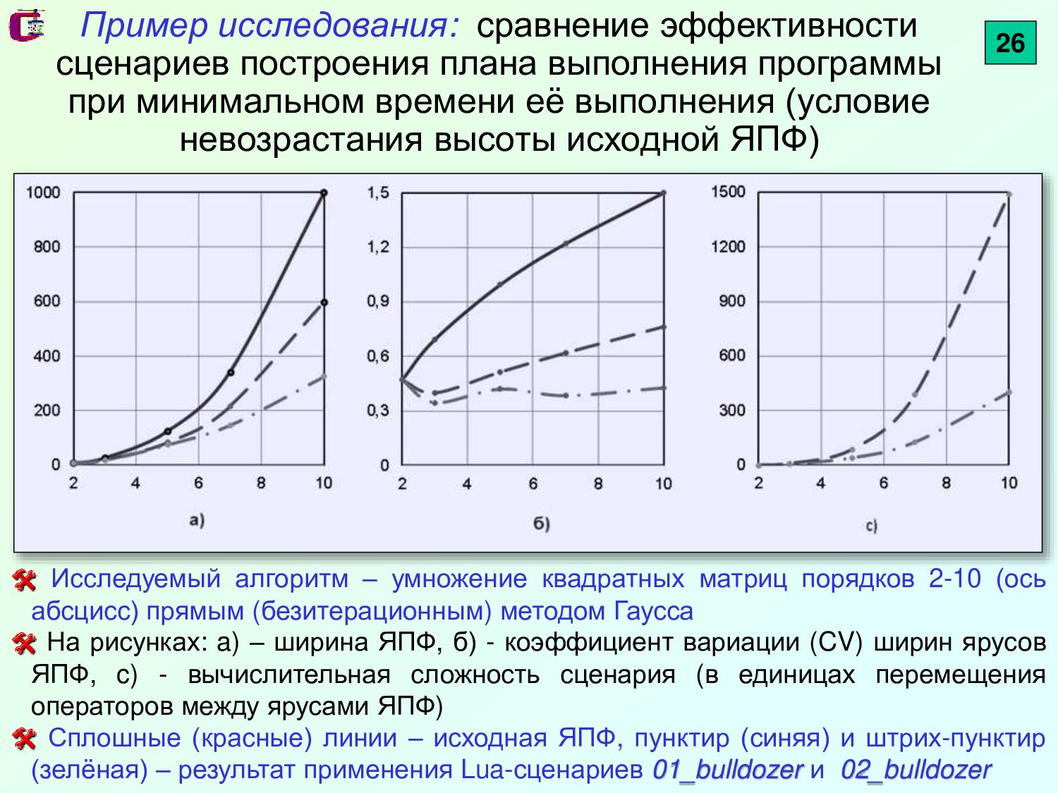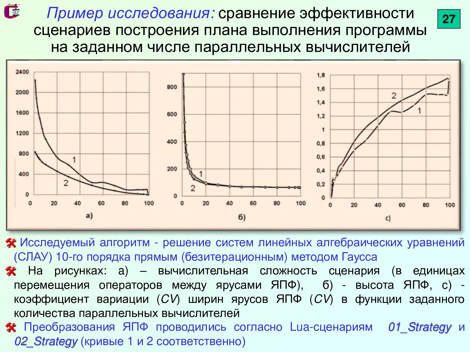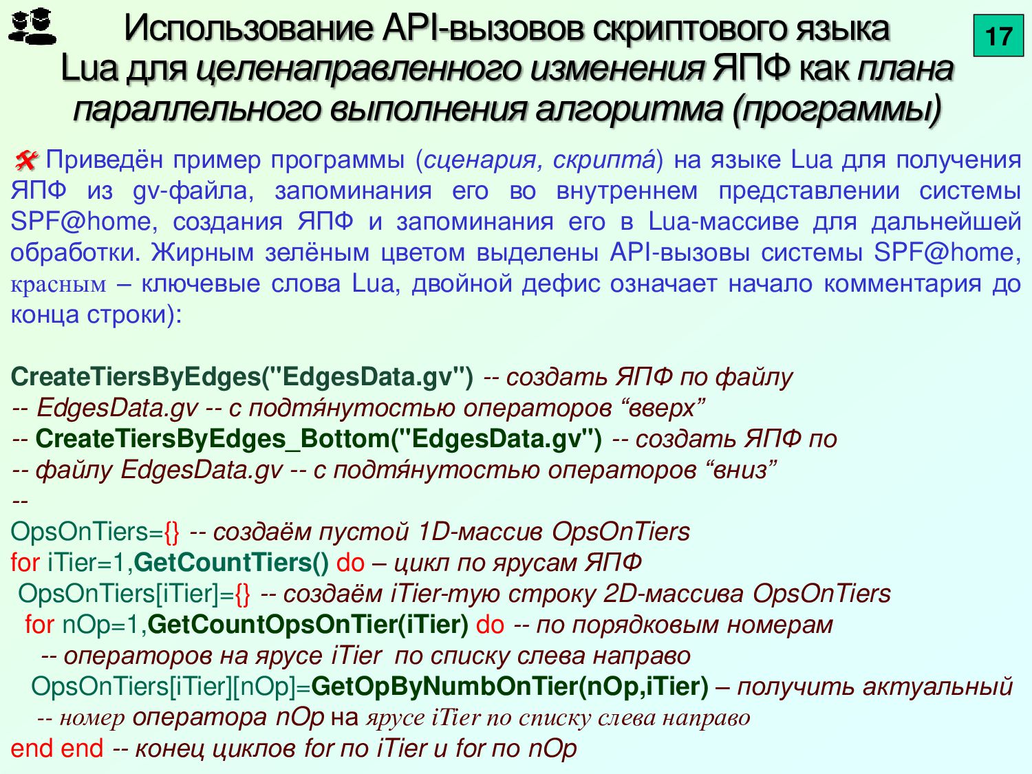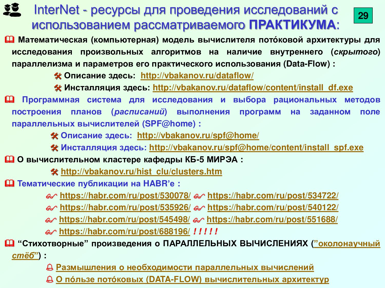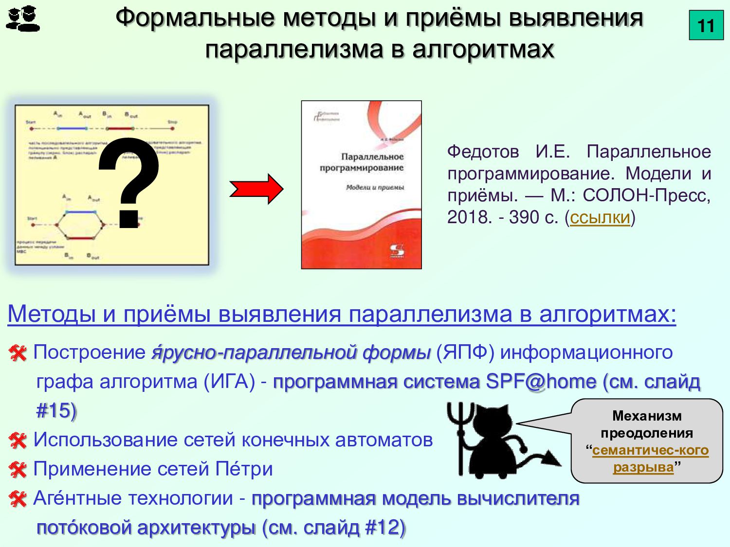 A, TWO, A2, !false ; A2 ← 2 * A MUL A, FOUR, A4 ; A4 ← 4 * A MUL B, NEG_ONE, B_NEG ; B_NEG ← NEG_ONE * B POW B, TWO, BB ; BB ← B^2 MUL A4, C, AC4 ; AC4 ← A4 * C SUB BB, AC4, D ; D[iskriminant] ← BB - AC4 SQR D, sqrt_D, IS_re ; ← sqrt(D) -> sqrt_D ADD B_NEG, sqrt_D, W1, IS_re ; W1 ← B_NEG + D_SQRT SUB B_NEG, sqrt_D, W2, IS_re ; W2 ← B_NEG - D_SQRT DIV W1, A2, re_X1, IS_re ; re_X1 ← W1/A2 DIV W2, A2, re_X2, IS_re ; re_X2 ← W2/A2 MUL D, NEG_ONE, NEG_D, !IS_re ; NEG_D ← NEG_ONE x D SQR NEG_D, sqrt_D, !IS_re ; sqrt_D ← sqrt(NEG_D) DIV B_NEG, A2, re_X1, !IS_re ; 1-th root (real) DIV sqrt_D, A2, im_X1, !IS_re ; 1-th root (img) CPY re_X1, re_X2, !IS_re ; 2-th root (real) DIV sqrt_D, A2, W, !IS_re ; temp for im_X2 MUL W, NEG_ONE, im_X2, !IS_re ; 2-th root (im) SET 1, A ; A ← 1 SET 3, B ; B ← 7/3 (re / im) SET 3, C ; C ← 3 SET 2, TWO ; TWO ← 2 SET 4, FOUR ; FOUR ← 4 SET -1, NEG_ONE ; NEG_ONE ← (-1) SET 0, ZERO ; ZERO ← 0 PGE D, ZERO, IS_re ; IS_re ← true if D>=0 13 Использована команда PGE, устанавливающая флаг предиката IS_re в зависимости от соотношения значений переменных D и ZERO В качестве флага-предиката здесь используется IS_re. Командой PGE D, ZERO, IS_re флаг IS_re устанавливается в ‘true’ при условии D≥0 (здесь D – дискриминант полного квадратного уравнения) или в ‘false’ в противном случае; далее вычисления производятся в зависимости от значения флага IS_re (четвёртое – необязательное - поле оператора). Применение предикатов позволяет ликвидировать ограничения в линейности используемых алгоритмов без применения регистра-счётчика команд. Предикатный метод даёт возможность уйти от (крайне высокозатра́тной) практики предсказа́ ния переходов в программах!