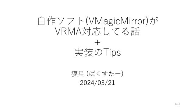 ・データ設計がイケてるか自信がない ・第三者がファイルを配布しにくい ・ 個人開発者として悩ましい → VRM Animationに移行判断 専用ファイル (.vmm_motion) 変換用コード 自作ソフト Help: https://malaybaku.github.io/VMagicMirror/tips/use_custom_motion/ GitHub: https://github.com/malaybaku/VMagicMirror_MotionExporter ファイル 自作コード 元データ (AnimationClip) 変換用Project セーブ ロード+再生 6