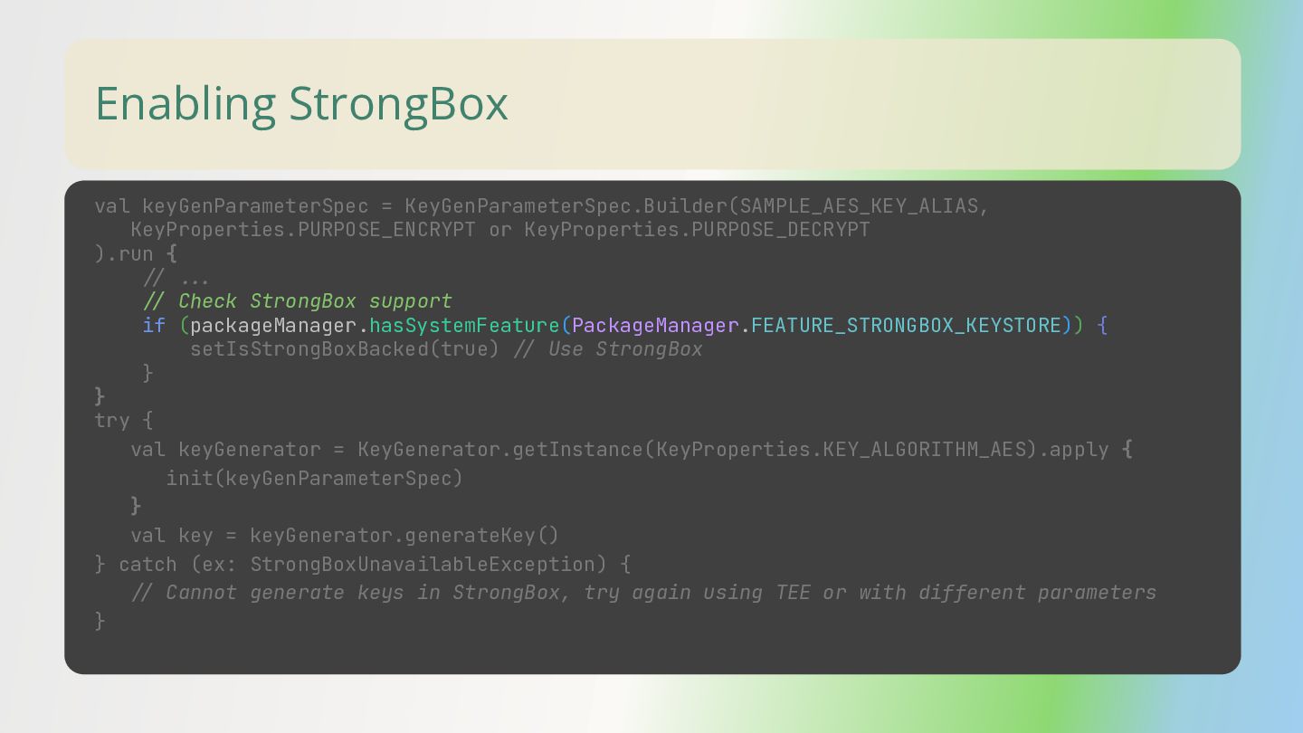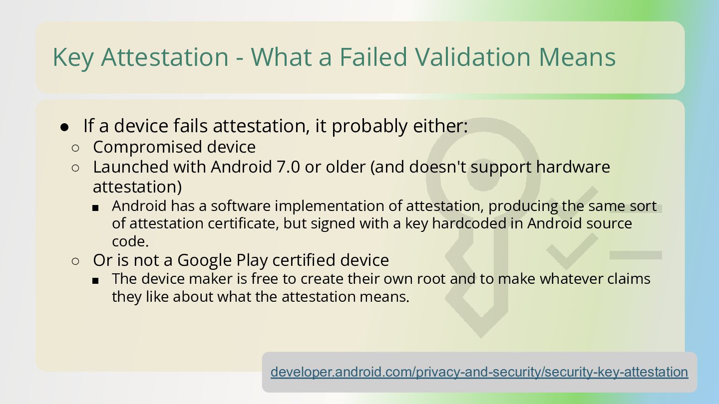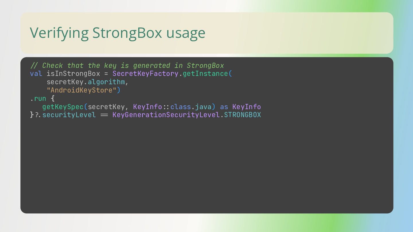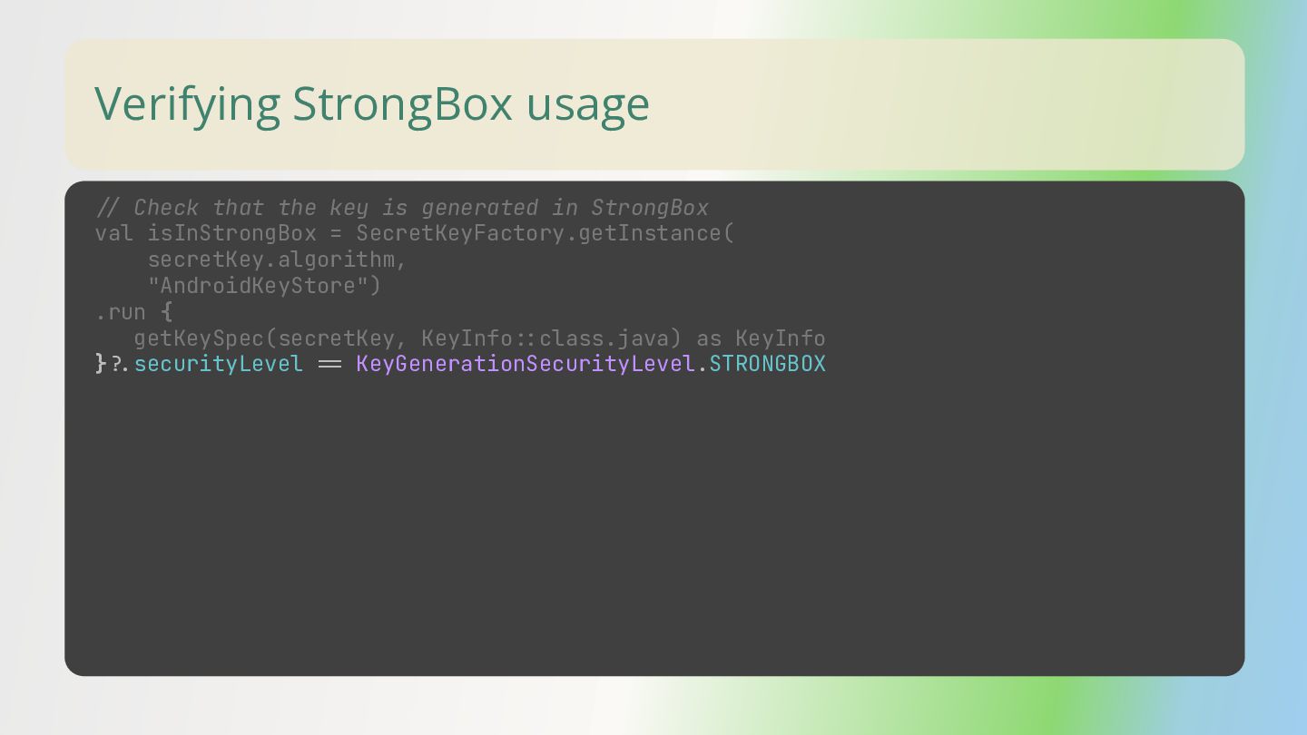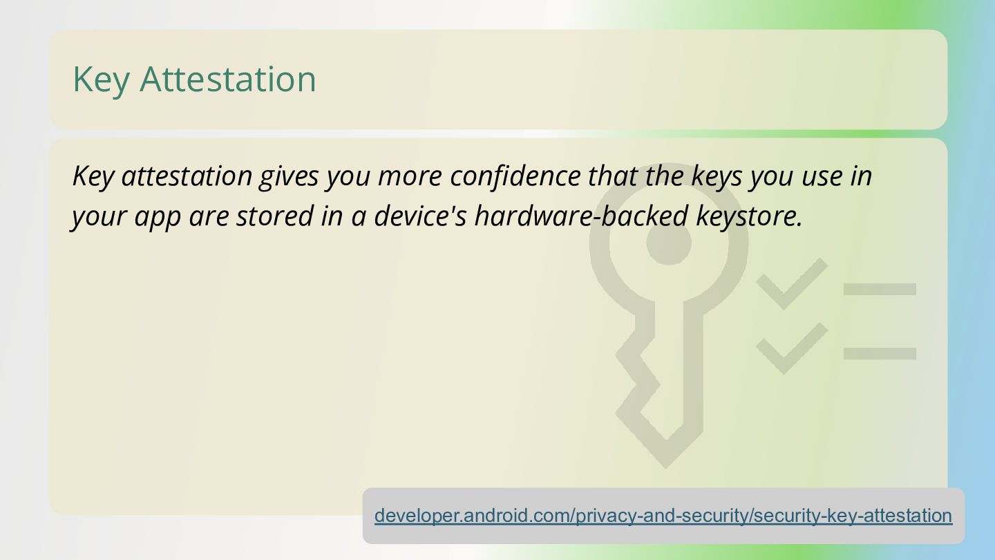 – How to use hardware-backed key storage, Strongbox, and how to verify them via key attestation.