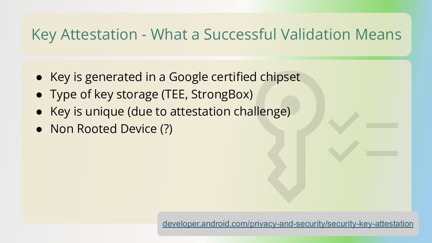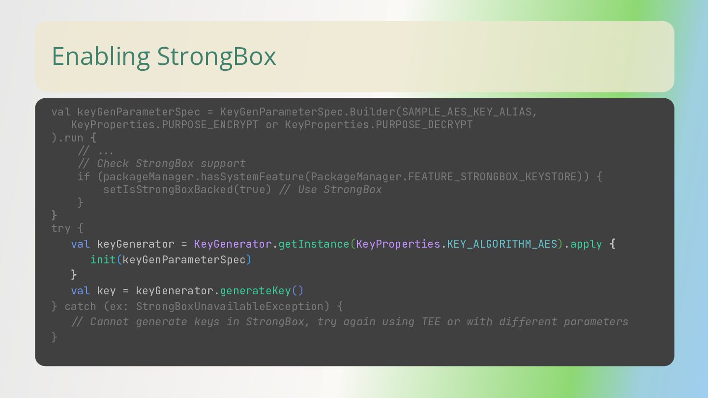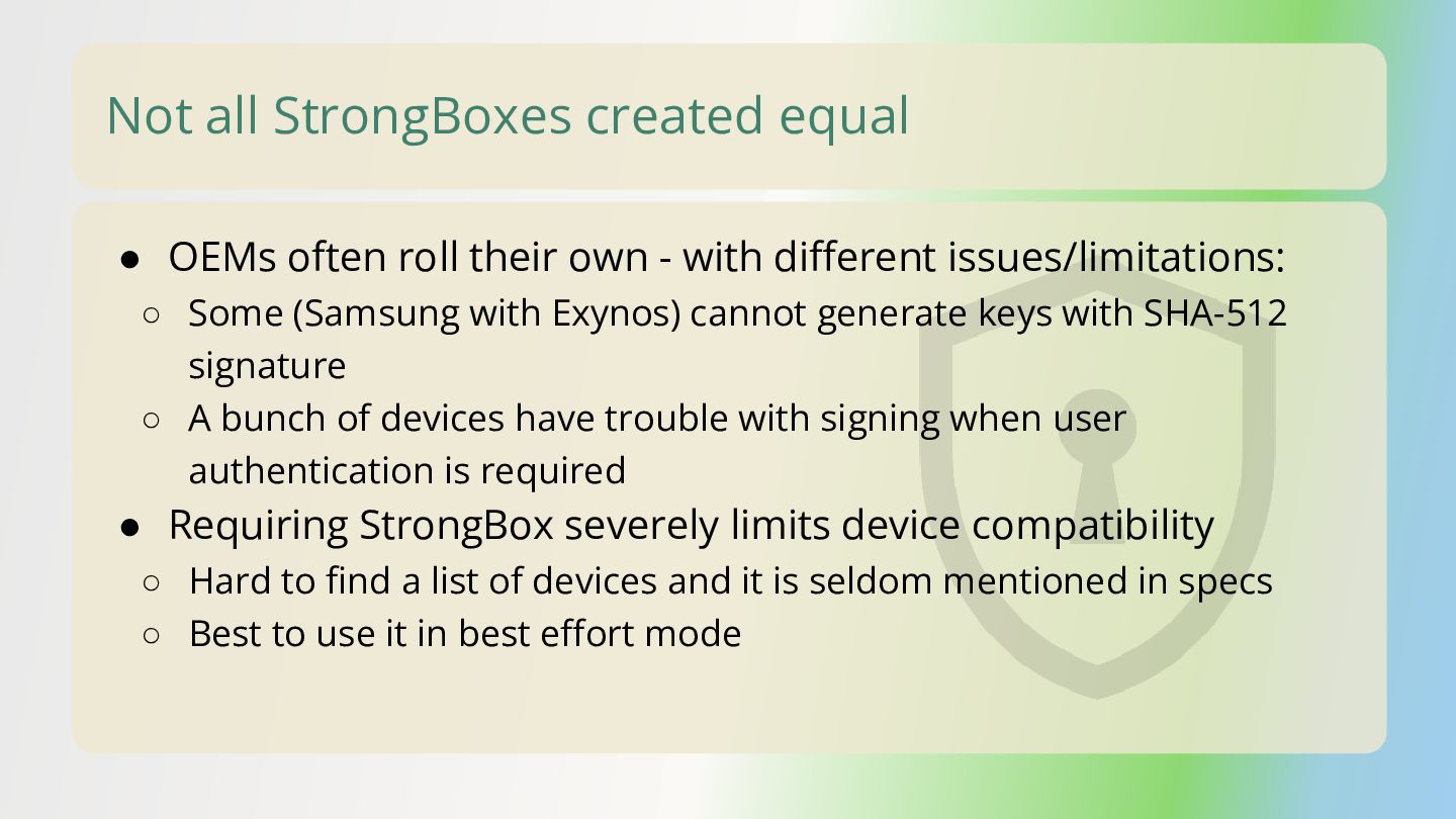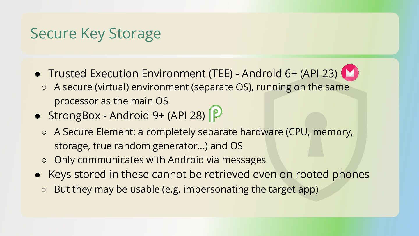 – How to use hardware-backed key storage, Strongbox, and how to verify them via key attestation.