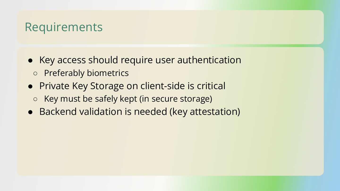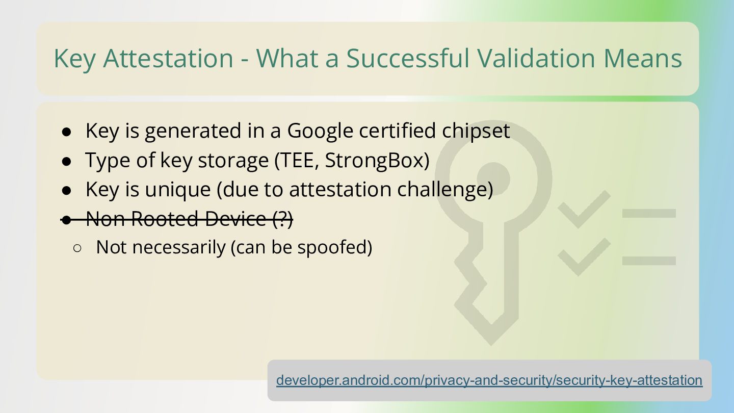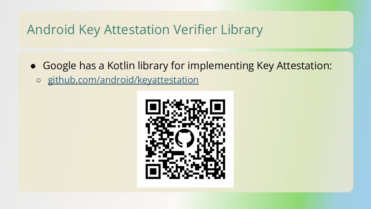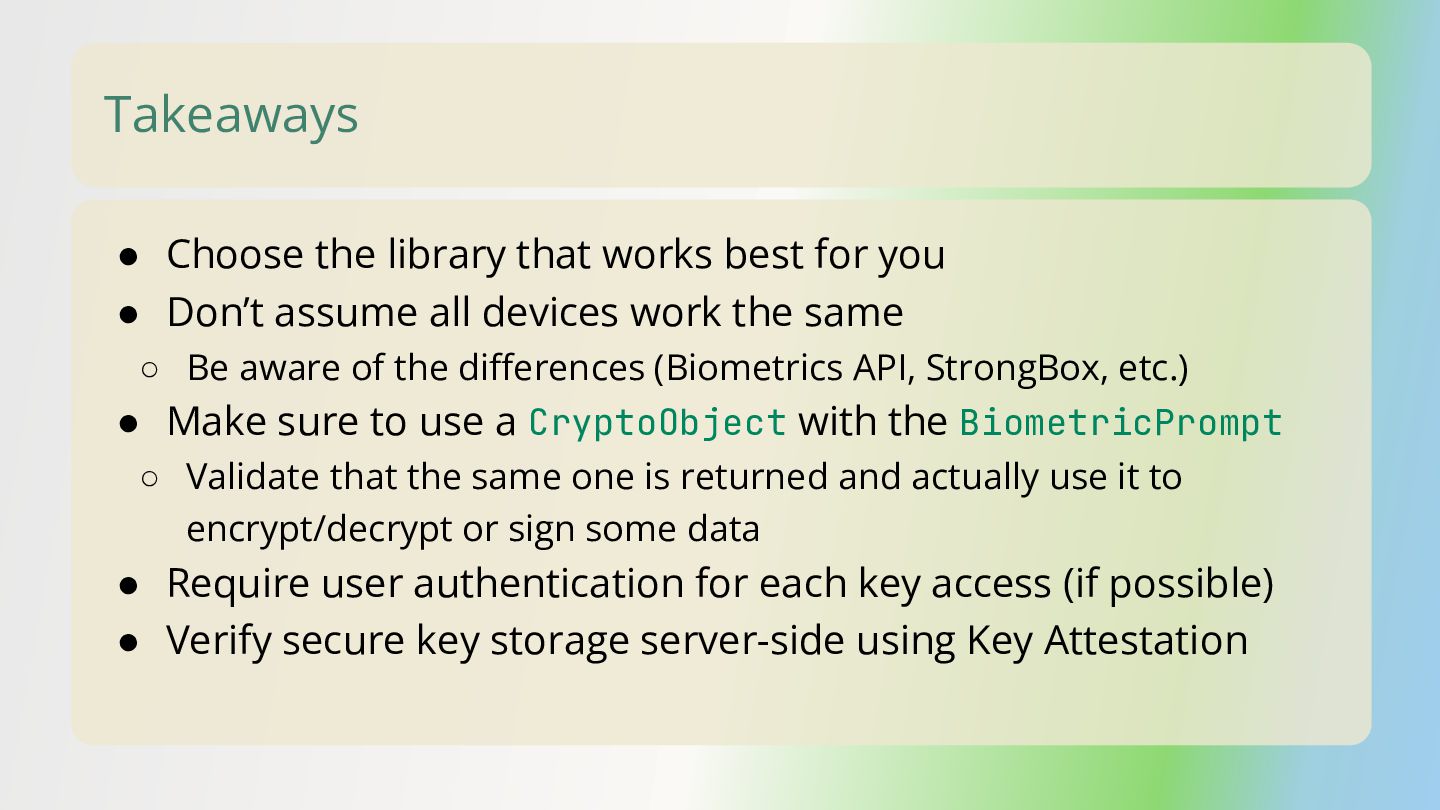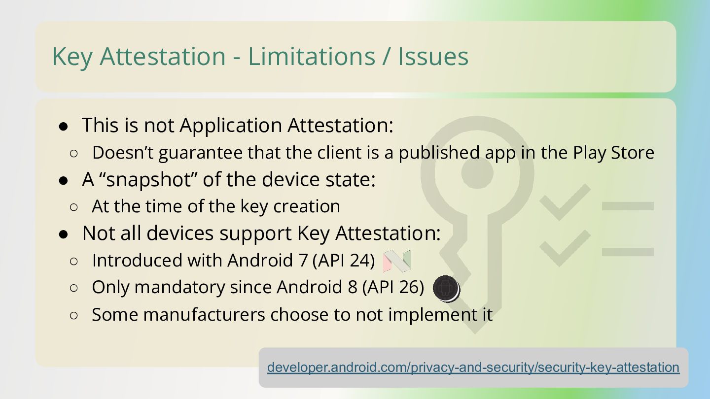 – How to use hardware-backed key storage, Strongbox, and how to verify them via key attestation.