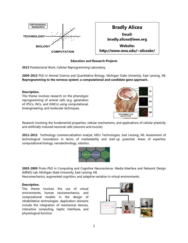 processes. Nature Precedings, npre.2009.3301.1 [http://precedings.nature.com/documents/3301/version/1] (2009). Alicea, B. Range-based techniques for discovering optimality and analyzing scaling relationships in neuromechanical systems. Nature Precedings, npre.2009.2845.2 [http://precedings.nature.com/documents/2845/version/2] (2009). Alicea, B. The adaptability of physiological systems optimizes performance: new directions in augmentation. arXiv repository, arXiv:0810.4884 [cs.HC, cs.NE] (2008). Alicea, B. Hierarchies of Biocomplexity: modeling life’s energetic complexity. arXiv repository, arXiv:0810.4547 [q-bio.PE, q-bio.OT] (2008). Alicea, B. Performance Augmentation in Hybrid Systems: techniques and experiment. arXiv repository, arXiv:0810.4629 [q-bio.NC, q-bio.QM] (2008). Carvallo-Pinto, M.A., Alicea, B., and Rodrigues, J.L.M. Towards a “core” genome: pairwise similarity searches on interspecific genomic data. arXiv repository, arXiv:0807.3353v1 [q-bio.GN, q-bio.PE] (2008). Alicea, B. Towards a theory of human intraspecific variation for ergonomics and human modeling. Society for Automotive Engineering (SAE) Digital Human Modeling, #2007-01-2461 (2007). Alicea, B. Real-time representations of whole brain dynamics: towards a computational model for hybrid systems and human performance. Understanding Complex Systems Symposium (2007). Alicea, B. Broad-Spectrum Mitigation and the Cognitive Neurobiological Interface: considering biological rhythms in Augmented Cognition. Proceedings of the Human Factors and Ergonomics Society (2006). Alicea, B. Filling up the tree: considering the self-organization of avian roosting behavior. Understanding Complex Systems Symposium (2006). Biocca, F. Alicea, B., Bohil, C., Owen, C.B., and Xiao, F. Targeting and Sensorimotor Behavior in Augmented Reality: from spatial memory to optimal patterns. Proceedings of the International Communication Association (2006). Yang, M-J., Alicea, B., Clark, C., and Larose, R. Does E-Trust Matter? A Social Cognitive Theory of Online Shopping Behavior. Proceedings of the International Communication Association (2005). Biocca, F. and Alicea, B. Is nanotechnology a communication technology? Proceedings of the International Communication Association (2004). Book Chapters: Alicea, B. and Cibelli, J.B. Comparing indirect-derived ES cells and directly-derived iPS cells. In “Principles of Cloning”. Elsevier, Amsterdam (2013). Bohil, C., Owen, C.B., Jeong, E.J., Alicea, B., and Biocca, F. Virtual Reality. In "21rst Century Communication: a reference book". Sage Publications, Washington, D.C (2009).