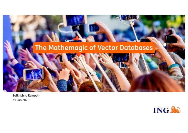 A binary search tree with each layer using a different dimension. Ø R- tree (Rectangle Tree) Ø Vectors are grouped into rectangles. Ø LSH (Locality-Sensitive Hashing) Ø Vectors are placed in buckets of hashes. Ø AANoy (Approximate Nearest Neighbours, Oh Yeah) Ø A forest of multiple binary search trees Ø HNSW (Hierarchical Navigable Small World) Ø ScaNN (Scalable Nearest Neighbours) Ø Hybrid approach with several techniques combined
