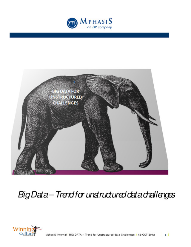 Challenges l 12-OCT-2012 l 4 l 1. Executive Summary The volumes and complexity of market data required by BFSI , Retail, Healthcare , Communication and Media , Energy and Utilities etc today are immense and growing rapidly. Ongoing market changes are accelerating the growth in demand for data, and forcing all the industries address the challenges of what has come to be known as “Big Data”. This demand is fueled as firms develop and deploy new, more sophisticated strategies. At the same time regulatory changes are also forcing firms to source and report increasingly larger amounts of trade data, as well as to adopt higher- quality – and usually data-hungry – risk and pricing models The explosive growth in the amount of data created in the world continues to accelerate and surprise us in terms of sheer volume. Transactional data has grown in velocity and volume at many companies Social network data is another source adding to the superabundance of data. The micro-blogging site Twitter serves more than 200 million users who produce more than 90 million “tweets” per day, or 800 per second. Each of these posts is approximately 200 bytes in size. On an average day, this traffic equals more than 12 gigabytes, and, throughout the Twitter ecosystem, the company produces a total of eight terabytes of data per day1 Facebook announced they had surpassed the 750 million active-user mark, making the social networking site the largest consumer-driven data source in the world. Facebook users spend more than 700 billion minutes per month on the service, and the average user creates 90 pieces of content every 30 days. Each month, the community creates more than 30 billion pieces of content ranging from Web links, news, stories, blog posts and notes, to videos and photos. Everywhere you look, the quantity of information in the world is soaring. The term “Big Data” has emerged to describe this monstrous growth in data. “Big Data” represents data sets whose characteristics are comprised of high volume, high velocity, and a variety of data structures.