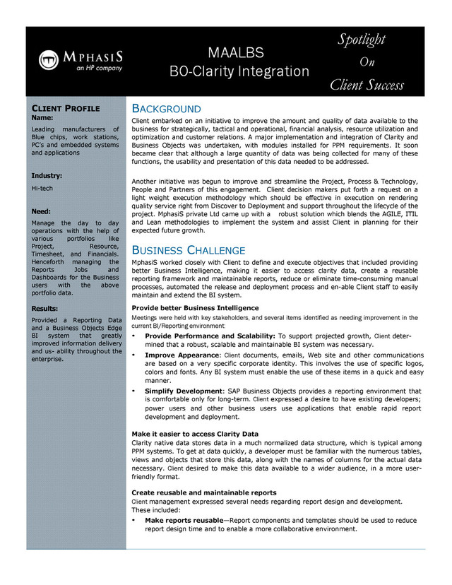 of Blue chips, work stations, PC’s and embedded systems and applications Industry: Hi-tech Need: Manage the day to day operations with the help of various portfolios like Project, Resource, Timesheet, and Financials. Henceforth managing the Reports Jobs and Dashboards for the Business users with the above portfolio data. Results: Provided a Reporting Data and a Business Objects Edge BI system that greatly improved information delivery and us- ability throughout the enterprise. Client embarked on an initiative to improve the amount and quality of data available to the business for strategically, tactical and operational, financial analysis, resource utilization and optimization and customer relations. A major implementation and integration of Clarity and Business Objects was undertaken, with modules installed for PPM requirements. It soon became clear that although a large quantity of data was being collected for many of these functions, the usability and presentation of this data needed to be addressed. Another initiative was begun to improve and streamline the Project, Process & Technology, People and Partners of this engagement. Client decision makers put forth a request on a light weight execution methodology which should be effective in execution on rendering quality service right from Discover to Deployment and support throughout the lifecycle of the project. MphasiS private Ltd came up with a robust solution which blends the AGILE, ITIL and Lean methodologies to implement the system and assist Client in planning for their expected future growth. BUSINESS CHALLENGE MphasiS worked closely with Client to define and execute objectives that included providing better Business Intelligence, making it easier to access clarity data, create a reusable reporting framework and maintainable reports, reduce or eliminate time-consuming manual processes, automated the release and deployment process and en-able Client staff to easily maintain and extend the BI system. Provide better Business Intelligence Meetings were held with key stakeholders, and several items identified as needing improvement in the current BI/Reporting environment: • Provide Performance and Scalability: To support projected growth, Client deter- mined that a robust, scalable and maintainable BI system was necessary. • Improve Appearance: Client documents, emails, Web site and other communications are based on a very specific corporate identity. This involves the use of specific logos, colors and fonts. Any BI system must enable the use of these items in a quick and easy manner. • Simplify Development: SAP Business Objects provides a reporting environment that is comfortable only for long-term. Client expressed a desire to have existing developers; power users and other business users use applications that enable rapid report development and deployment. Make it easier to access Clarity Data Clarity native data stores data in a much normalized data structure, which is typical among PPM systems. To get at data quickly, a developer must be familiar with the numerous tables, views and objects that store this data, along with the names of columns for the actual data necessary. Client desired to make this data available to a wider audience, in a more user- friendly format. Create reusable and maintainable reports Client management expressed several needs regarding report design and development. These included: • Make reports reusable—Report components and templates should be used to reduce report design time and to enable a more collaborative environment.